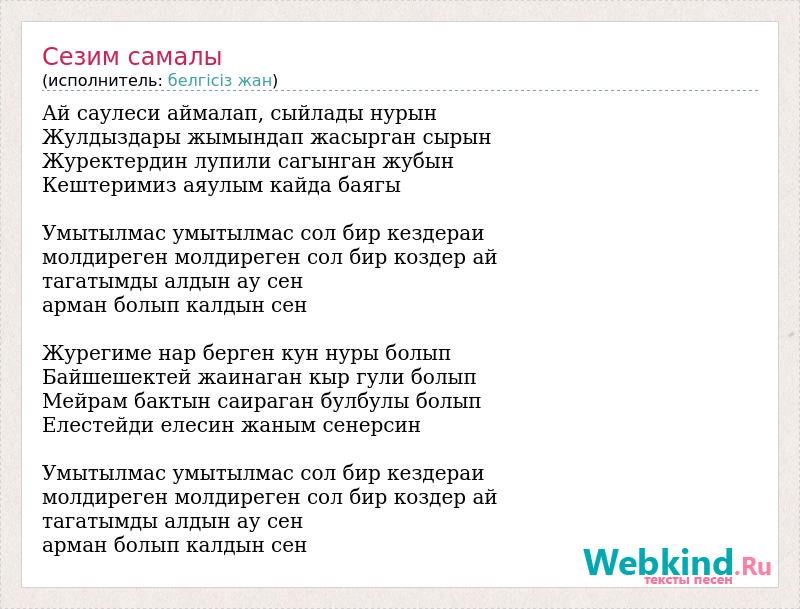Ай саулеси аймалап, сыйлады нурын Жулдыздары жымындап жасырган сырын Журектердин лупили сагынган жубын Кештеримиз аяулым кайда баягы Умытылмас умытылмас сол бир кездераи молдиреген молдиреген сол бир коздер ай тагатымды алдын ау сен арман болып калдын сен Журегиме нар берген кун нуры болып Байшешектей жаинаган кыр гули болып Мейрам бактын саираган булбулы болып Елестейди елесин жаным сенерсин Умытылмас умытылмас сол бир кездераи молдиреген молдиреген сол бир коздер ай тагатымды алдын ау сен арман болып калдын сен