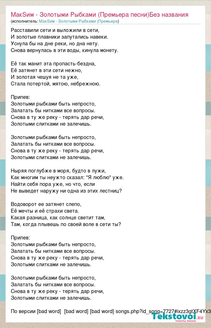 Расставили сети и выложили в сети, И золотые плавники запутались навеки. Уснула бы на дне реки, но дна нету. Снова вернулась в эти воды, кинула монету. Её так манит эта пропасть-бездна, Её затянет в эти сети нежно, И золотая чешуя не та уже, Стала потертой, мятою, небрежною. Припев: Золотыми рыбками быть непросто, Залатать бы нитками все вопросы. Снова в ту же реку - терять дар речи, Золотыми слитками не залечишь. Золотыми рыбками быть непросто, Залатать бы нитками все вопросы. Снова в ту же реку - терять дар речи, Золотыми слитками не залечишь. Ныряя поглубже в моря, будто в лужи, Как многим ты неужто сказал: "Я люблю" уже. Найти себя пора уже, но что, если Не выведет наружу ни одна из этих лестниц? Водоворот ее затянет слепо, Её мечты и её страхи света. Какая разница, как солнце светит там, Там, когда плывешь по своей воле в сети ты? Припев: Золотыми рыбками быть непросто, Залатать бы нитками все вопросы. Снова в ту же реку - терять дар речи, Золотыми слитками не залечишь. Золотыми рыбками быть непросто, Залатать бы нитками все вопросы. Снова в ту же реку - терять дар речи, Золотыми слитками не залечишь. По версии [bad word] [bad word] [bad word] songs.php?id_song=7727#ixzz3gtXF4Yx3