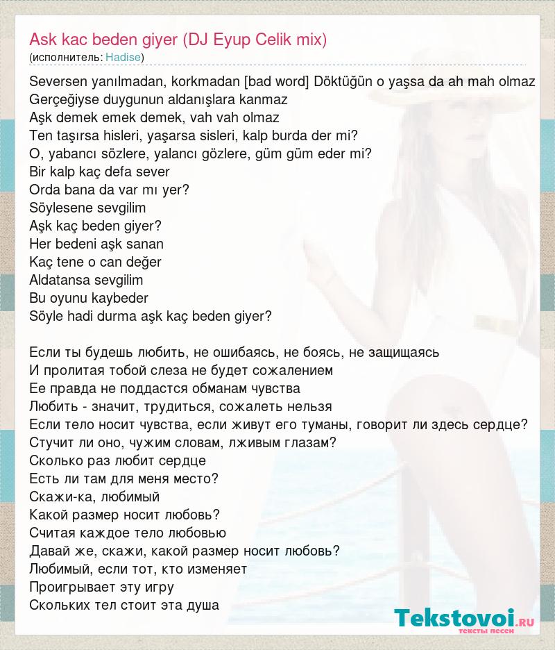 Seversen yanılmadan, korkmadan korunmadan Döktüğün o yaşsa da ah mah olmaz Gerçeğiyse duygunun aldanışlara kanmaz Aşk demek emek demek, vah vah olmaz Ten taşırsa hisleri, yaşarsa sisleri, kalp burda der mi? O, yabancı sözlere, yalancı gözlere, güm güm eder mi? Bir kalp kaç defa sever Orda bana da var mı yer? Söylesene sevgilim Aşk kaç beden giyer? Her bedeni aşk sanan Kaç tene o can değer Aldatansa sevgilim Bu oyunu kaybeder Söyle hadi durma aşk kaç beden giyer? Если ты будешь любить, не ошибаясь, не боясь, не защищаясь И пролитая тобой слеза не будет сожалением Ее правда не поддастся обманам чувства Любить - значит, трудиться, сожалеть нельзя Если тело носит чувства, если живут его туманы, говорит ли здесь сердце? Стучит ли оно, чужим словам, лживым глазам? Сколько раз любит сердце Есть ли там для меня место? Скажи-ка, любимый Какой размер носит любовь? Считая каждое тело любовью Давай же, скажи, какой размер носит любовь? Любимый, если тот, кто изменяет Проигрывает эту игру Скольких тел стоит эта душа