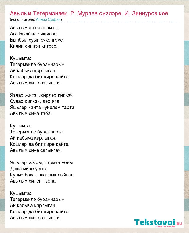 Авылым арты эрэмэле Ага Былбыл чишмэсе. Былбыл суын эчкэнгэме Килми синнэн китэсе. Кушымта: Тегермэнле бураннарын Ай кабыча карлыгач. Кошлар да бит кире кайта Авылым сине сагынгач. Язлар житэ, жирлэр кипкэч Сулар кипкэч, дэр яга Яшьлэр кайта кунелем тарта Авылым сина таба. Кушымта: Тегермэнле бураннарын Ай кабыча карлыгач. Кошлар да бит кире кайта Авылым сине сагынгач. Яшьлэр жыры, гармун моны Дэшэ мине уенга. Купме бэхет, шатлык сыйган Авылым синен туена. Кушымта: Тегермэнле бураннарын Ай кабыча карлыгач. Кошлар да бит кире кайта Авылым сине сагынгач.