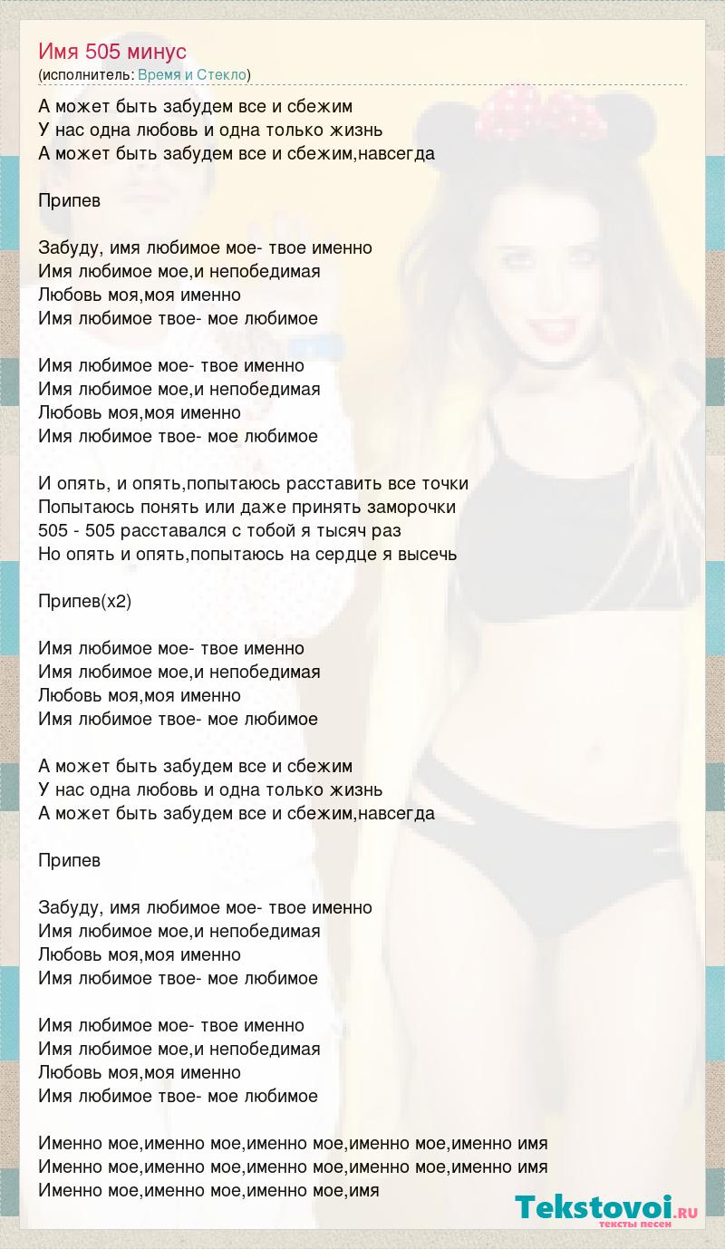 А может быть забудем все и сбежим У нас одна любовь и одна только жизнь А может быть забудем все и сбежим,навсегда Припев Забуду, имя любимое мое- твое именно Имя любимое мое,и непобедимая Любовь моя,моя именно Имя любимое твое- мое любимое Имя любимое мое- твое именно Имя любимое мое,и непобедимая Любовь моя,моя именно Имя любимое твое- мое любимое И опять, и опять,попытаюсь расставить все точки Попытаюсь понять или даже принять заморочки 505 - 505 расставался с тобой я тысяч раз Но опять и опять,попытаюсь на сердце я высечь Припев(х2) Имя любимое мое- твое именно Имя любимое мое,и непобедимая Любовь моя,моя именно Имя любимое твое- мое любимое А может быть забудем все и сбежим У нас одна любовь и одна только жизнь А может быть забудем все и сбежим,навсегда Припев Забуду, имя любимое мое- твое именно Имя любимое мое,и непобедимая Любовь моя,моя именно Имя любимое твое- мое любимое Имя любимое мое- твое именно Имя любимое мое,и непобедимая Любовь моя,моя именно Имя любимое твое- мое любимое Именно мое,именно мое,именно мое,именно мое,именно имя Именно мое,именно мое,именно мое,именно мое,именно имя Именно мое,именно мое,именно мое,имя