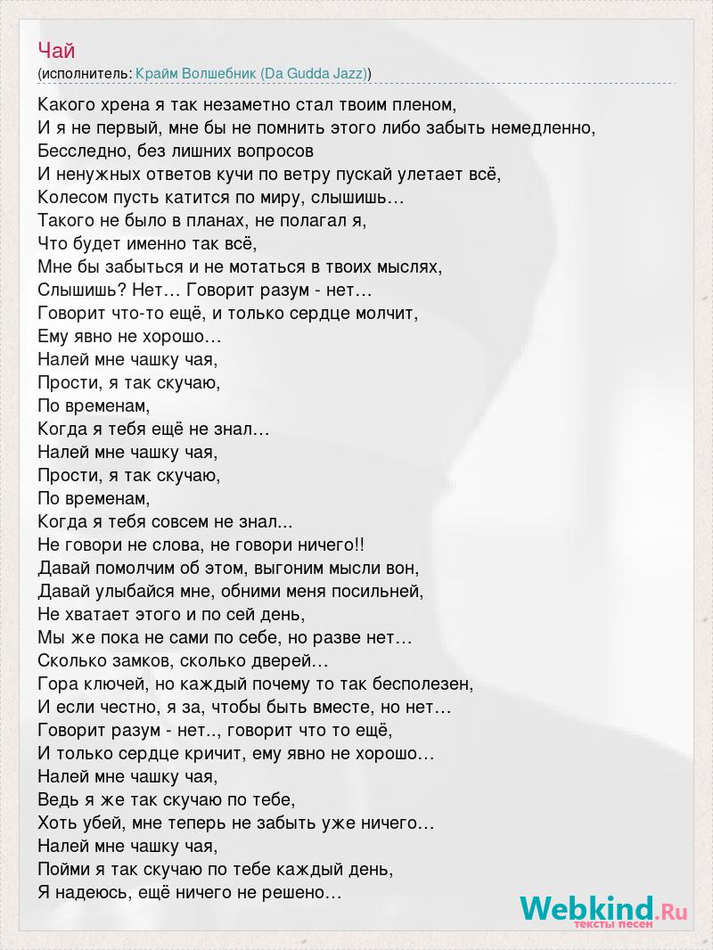 Какого хрена я так незаметно стал твоим пленом, И я не первый, мне бы не помнить этого либо забыть немедленно, Бесследно, без лишних вопросов И ненужных ответов кучи по ветру пускай улетает всё, Колесом пусть катится по миру, слышишь… Такого не было в планах, не полагал я, Что будет именно так всё, Мне бы забыться и не мотаться в твоих мыслях, Слышишь? Нет… Говорит разум - нет… Говорит что-то ещё, и только сердце молчит, Ему явно не хорошо… Налей мне чашку чая, Прости, я так скучаю, По временам, Когда я тебя ещё не знал… Налей мне чашку чая, Прости, я так скучаю, По временам, Когда я тебя совсем не знал... Не говори не слова, не говори ничего!! Давай помолчим об этом, выгоним мысли вон, Давай улыбайся мне, обними меня посильней, Не хватает этого и по сей день, Мы же пока не сами по себе, но разве нет… Сколько замков, сколько дверей… Гора ключей, но каждый почему то так бесполезен, И если честно, я за, чтобы быть вместе, но нет… Говорит разум - нет.., говорит что то ещё, И только сердце кричит, ему явно не хорошо… Налей мне чашку чая, Ведь я же так скучаю по тебе, Хоть убей, мне теперь не забыть уже ничего… Налей мне чашку чая, Пойми я так скучаю по тебе каждый день, Я надеюсь, ещё ничего не решено…