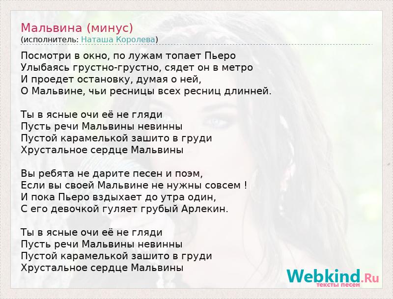 Посмотри в окно, по лужам топает Пьеро Улыбаясь грустно-грустно, сядет он в метро И проедет остановку, думая о ней, О Мальвине, чьи ресницы всех ресниц длинней. Ты в ясные очи её не гляди Пусть речи Мальвины невинны Пустой карамелькой зашито в груди Хрустальное сердце Мальвины Вы ребята не дарите песен и поэм, Если вы своей Мальвине не нужны совсем ! И пока Пьеро вздыхает до утра один, С его девочкой гуляет грубый Арлекин. Ты в ясные очи её не гляди Пусть речи Мальвины невинны Пустой карамелькой зашито в груди Хрустальное сердце Мальвины