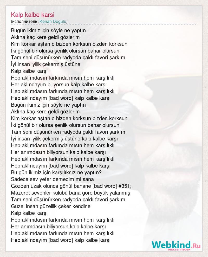 Bugün ikimiz için söyle ne yaptın Aklına kaç kere geldi gözlerim Kim korkar aştan o bizden korksun bizden korksun İki gönül bir olursa şenlik olursun bahar olursun Tam seni düşünürken radyoda çaldı favori şarkım İyi insan iyilik çekermiş üstüne Kalp kalbe karşı Hep aklımdasın farkında mısın hem karşılıklı Her aklındayım biliyorsun kalp kalbe karşı Hep aklımdasın farkında mısın hem karşılıklı Hep aklındayım [bad word] kalp kalbe karşı Bugün ikimiz için söyle ne yaptın Aklına kaç kere geldi gözlerim Kim korkar aştan o bizden korksun bizden korksun İki gönül bir olursa şenlik olursun bahar olursun Tam seni düşünürken radyoda çaldı favori şarkım İyi insan iyilik çekermiş üstüne kalp kalbe karşı Hep aklımdasın farkında mısın hem karşılıklı Her anımdasın biliyorsun kalp kalbe karşı Hep aklımdasın farkında mısın hem karşılıklı Hep aklındayım [bad word] kalp kalbe karşı Bu gün ikimiz için karşılıksız ne yaptın? Sadece sev yeter demedim mi sana Gözden uzak olunca gönül bahane [bad word] #351; Mazeret sevenler kulübü bana göre büyük yalanmış Tam seni düşünürken radyoda çaldı favori şarkım Güzel insan güzellik çeker kendine Kalp kalbe karşı Hep aklımdasın farkında mısın hem karşılıklı Her anımdasın biliyorsun kalp kalbe karşı Hep aklımdasın farkında mısın hem karşılıklı Hep aklındayım [bad word] kalp kalbe karşı