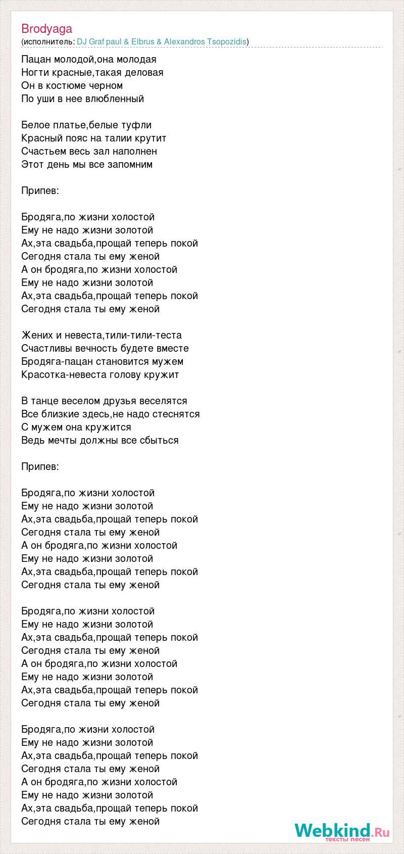 Пацан молодой,она молодая Ногти красные,такая деловая Он в костюме черном По уши в нее влюбленный Белое платье,белые туфли Красный пояс на талии крутит Счастьем весь зал наполнен Этот день мы все запомним Припев: Бродяга,по жизни холостой Ему не надо жизни золотой Ах,эта свадьба,прощай теперь покой Сегодня стала ты ему женой А он бродяга,по жизни холостой Ему не надо жизни золотой Ах,эта свадьба,прощай теперь покой Сегодня стала ты ему женой Жених и невеста,тили-тили-теста Счастливы вечность будете вместе Бродяга-пацан становится мужем Красотка-невеста голову кружит В танце веселом друзья веселятся Все близкие здесь,не надо стеснятся С мужем она кружится Ведь мечты должны все сбыться Припев: Бродяга,по жизни холостой Ему не надо жизни золотой Ах,эта свадьба,прощай теперь покой Сегодня стала ты ему женой А он бродяга,по жизни холостой Ему не надо жизни золотой Ах,эта свадьба,прощай теперь покой Сегодня стала ты ему женой Бродяга,по жизни холостой Ему не надо жизни золотой Ах,эта свадьба,прощай теперь покой Сегодня стала ты ему женой А он бродяга,по жизни холостой Ему не надо жизни золотой Ах,эта свадьба,прощай теперь покой Сегодня стала ты ему женой Бродяга,по жизни холостой Ему не надо жизни золотой Ах,эта свадьба,прощай теперь покой Сегодня стала ты ему женой А он бродяга,по жизни холостой Ему не надо жизни золотой Ах,эта свадьба,прощай теперь покой Сегодня стала ты ему женой