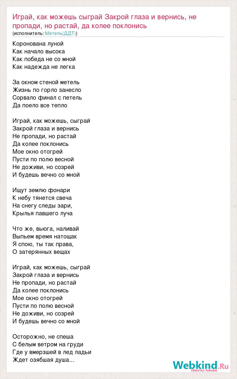 Главная→Исполнители→Метель(ДДТ)→Играй, как можешь сыграй Закрой глаза и вернись, не пропади, но растай,