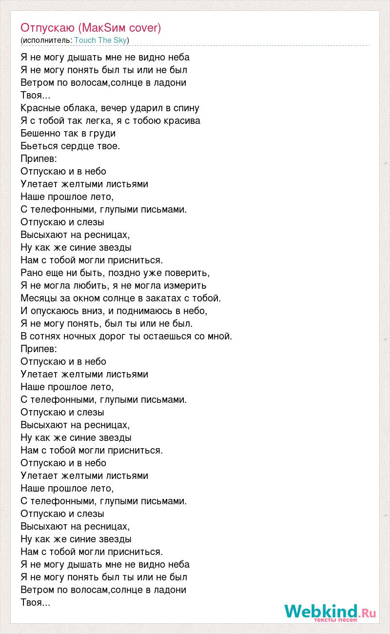 Я не могу дышать мне не видно неба Я не могу понять был ты или не был Ветром по волосам,солнце в ладони Твоя... Красные облака, вечер ударил в спину Я с тобой так легка, я с тобою красива Бешенно так в груди Бьеться сердце твое. Припев: Отпускаю и в небо Улетает желтыми листьями Наше прошлое лето, С телефонными, глупыми письмами. Отпускаю и слезы Высыхают на ресницах, Ну как же синие звезды Нам с тобой могли присниться. Рано еще ни быть, поздно уже поверить, Я не могла любить, я не могла измерить Месяцы за окном солнце в закатах с тобой. И опускаюсь вниз, и поднимаюсь в небо, Я не могу понять, был ты или не был. В сотнях ночных дорог ты остаешься со мной. Припев: Отпускаю и в небо Улетает желтыми листьями Наше прошлое лето, С телефонными, глупыми письмами. Отпускаю и слезы Высыхают на ресницах, Ну как же синие звезды Нам с тобой могли присниться. Отпускаю и в небо Улетает желтыми листьями Наше прошлое лето, С телефонными, глупыми письмами. Отпускаю и слезы Высыхают на ресницах, Ну как же синие звезды Нам с тобой могли присниться. Я не могу дышать мне не видно неба Я не могу понять был ты или не был Ветром по волосам,солнце в ладони Твоя...