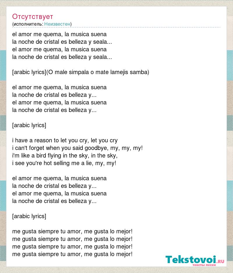 el amor me quema, la musica suena la noche de cristal es belleza y sealа... el amor me quema, la musica suena la noche de cristal es belleza y seala... [arabic lyrics](O male simpala o mate lamejis samba) el amor me quema, la musica suena la noche de cristal es belleza y... el amor me quema, la musica suena la noche de cristal es belleza y... [arabic lyrics] i have a reason to let you cry, let you cry i can't forget when you said goodbye, my, my, my! i'm like a bird flying in the sky, in the sky, i see you're hot selling me a lie, my, my! el amor me quema, la musica suena la noche de cristal es belleza y... el amor me quema, la musica suena la noche de cristal es belleza y... [arabic lyrics] me gusta siempre tu amor, me gusta lo mejor! me gusta siempre tu amor, me gusta lo mejor! me gusta siempre tu amor, me gusta lo mejor! me gusta siempre tu amor, me gusta lo mejor!