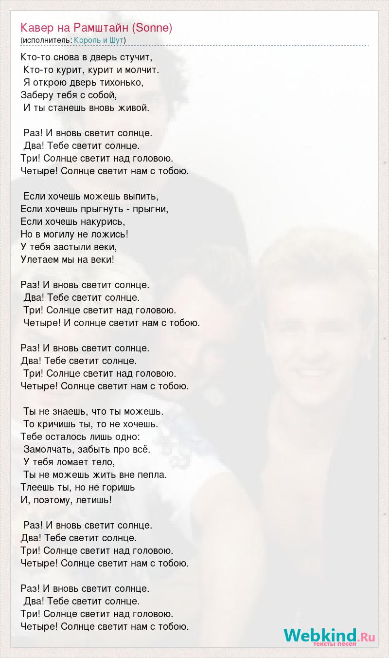 Кто-то снова в дверь стучит, Кто-то курит, курит и молчит. Я открою дверь тихонько, Заберу тебя с собой, И ты станешь вновь живой. Раз! И вновь светит солнце. Два! Тебе светит солнце. Три! Солнце светит над головою. Четыре! Солнце светит нам с тобою. Если хочешь можешь выпить, Если хочешь прыгнуть - прыгни, Если хочешь накурись, Но в могилу не ложись! У тебя застыли веки, Улетаем мы на веки! Раз! И вновь светит солнце. Два! Тебе светит солнце. Три! Солнце светит над головою. Четыре! И солнце светит нам с тобою. Раз! И вновь светит солнце. Два! Тебе светит солнце. Три! Солнце светит над головою. Четыре! Солнце светит нам с тобою. Ты не знаешь, что ты можешь. То кричишь ты, то не хочешь. Тебе осталось лишь одно: Замолчать, забыть про всё. У тебя ломает тело, Ты не можешь жить вне пепла. Тлеешь ты, но не горишь И, поэтому, летишь! Раз! И вновь светит солнце. Два! Тебе светит солнце. Три! Солнце светит над головою. Четыре! Солнце светит нам с тобою. Раз! И вновь светит солнце. Два! Тебе светит солнце. Три! Солнце светит над головою. Четыре! Солнце светит нам с тобою.