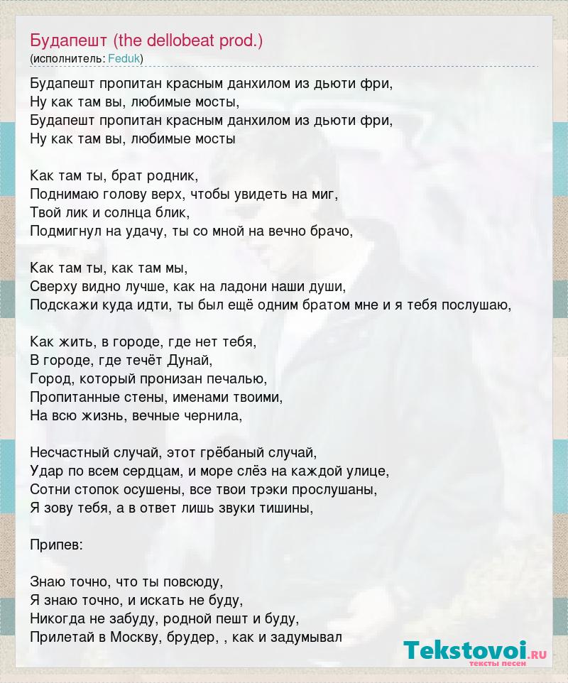 Будапешт пропитан красным данхилом из дьюти фри, Ну как там вы, любимые мосты, Будапешт пропитан красным данхилом из дьюти фри, Ну как там вы, любимые мосты Как там ты, брат родник, Поднимаю голову верх, чтобы увидеть на миг, Твой лик и солнца блик, Подмигнул на удачу, ты со мной на вечно брачо, Как там ты, как там мы, Сверху видно лучше, как на ладони наши души, Подскажи куда идти, ты был ещё одним братом мне и я тебя послушаю, Как жить, в городе, где нет тебя, В городе, где течёт Дунай, Город, который пронизан печалью, Пропитанные стены, именами твоими, На всю жизнь, вечные чернила, Несчастный случай, этот грёбаный случай, Удар по всем сердцам, и море слёз на каждой улице, Сотни стопок осушены, все твои трэки прослушаны, Я зову тебя, а в ответ лишь звуки тишины, Припев: Знаю точно, что ты повсюду, Я знаю точно, и искать не буду, Никогда не забуду, родной пешт и буду, Прилетай в Москву, брудер, , как и задумывал