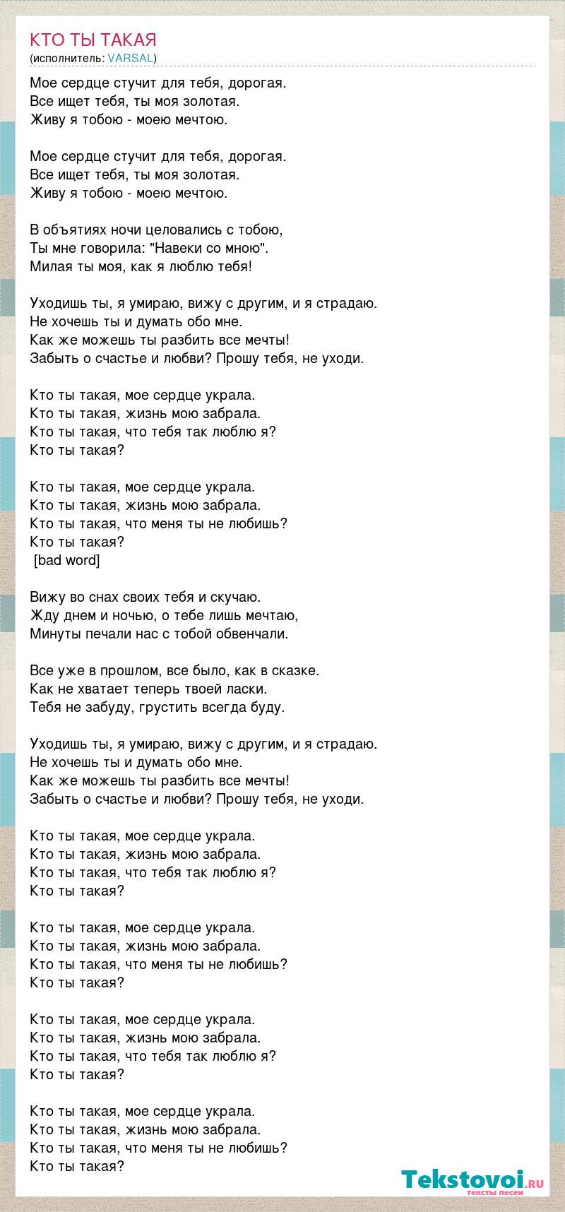 Мое сердце стучит для тебя, дорогая. Все ищет тебя, ты моя золотая. Живу я тобою - моею мечтою. Мое сердце стучит для тебя, дорогая. Все ищет тебя, ты моя золотая. Живу я тобою - моею мечтою. В объятиях ночи целовались с тобою, Ты мне говорила: "Навеки со мною". Милая ты моя, как я люблю тебя! Уходишь ты, я умираю, вижу с другим, и я страдаю. Не хочешь ты и думать обо мне. Как же можешь ты разбить все мечты! Забыть о счастье и любви? Прошу тебя, не уходи. Кто ты такая, мое сердце украла. Кто ты такая, жизнь мою забрала. Кто ты такая, что тебя так люблю я? Кто ты такая? Кто ты такая, мое сердце украла. Кто ты такая, жизнь мою забрала. Кто ты такая, что меня ты не любишь? Кто ты такая? [Instrumental] Вижу во снах своих тебя и скучаю. Жду днем и ночью, о тебе лишь мечтаю, Минуты печали нас с тобой обвенчали. Все уже в прошлом, все было, как в сказке. Как не хватает теперь твоей ласки. Тебя не забуду, грустить всегда буду. Уходишь ты, я умираю, вижу с другим, и я страдаю. Не хочешь ты и думать обо мне. Как же можешь ты разбить все мечты! Забыть о счастье и любви? Прошу тебя, не уходи. Кто ты такая, мое сердце украла. Кто ты такая, жизнь мою забрала. Кто ты такая, что тебя так люблю я? Кто ты такая? Кто ты такая, мое сердце украла. Кто ты такая, жизнь мою забрала. Кто ты такая, что меня ты не любишь? Кто ты такая? Кто ты такая, мое сердце украла. Кто ты такая, жизнь мою забрала. Кто ты такая, что тебя так люблю я? Кто ты такая? Кто ты такая, мое сердце украла. Кто ты такая, жизнь мою забрала. Кто ты такая, что меня ты не любишь? Кто ты такая?