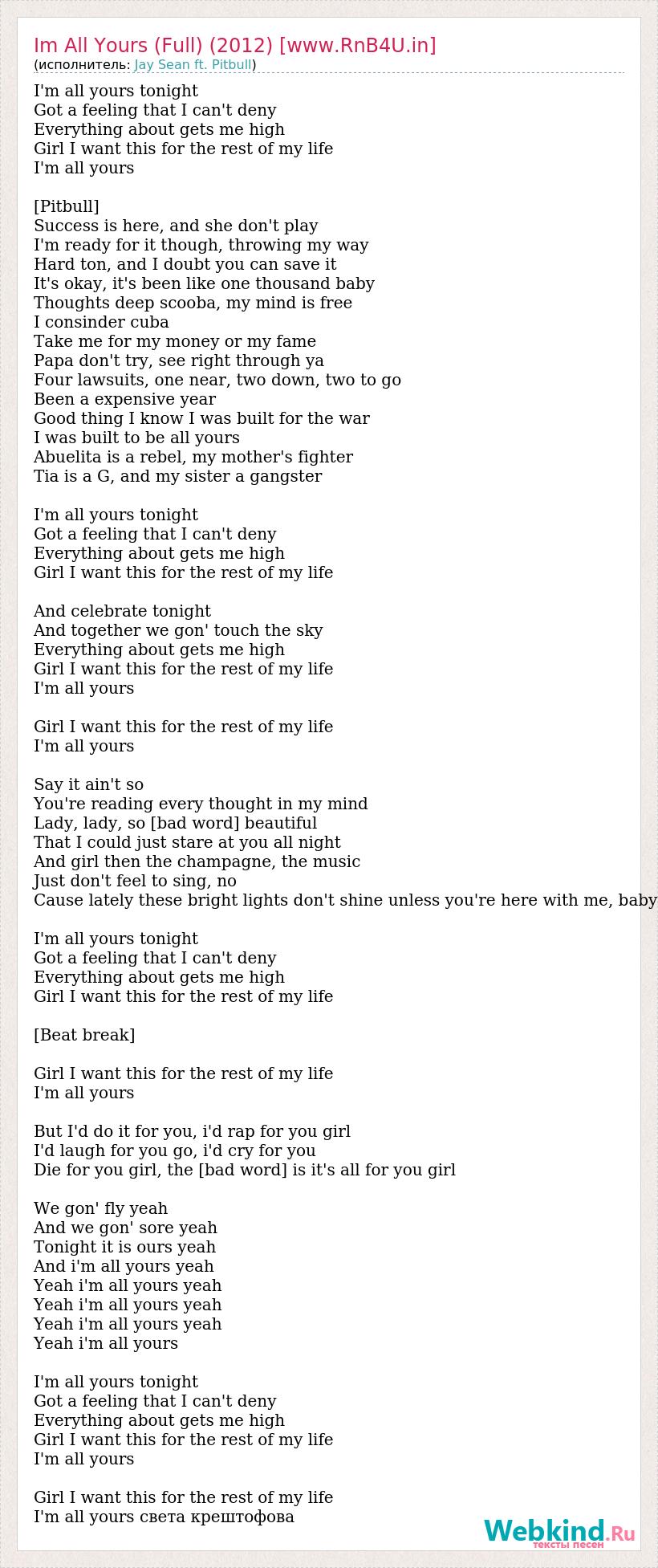 I'm all yours tonight Got a feeling that I can't deny Everything about gets me high Girl I want this for the rest of my life I'm all yours [Pitbull] Success is here, and she don't play I'm ready for it though, throwing my way Hard ton, and I doubt you can save it It's okay, it's been like one thousand baby Thoughts deep scooba, my mind is free I consinder cuba Take me for my money or my fame Papa don't try, see right through ya Four lawsuits, one near, two down, two to go Been a expensive year Good thing I know I was built for the war I was built to be all yours Abuelita is a rebel, my mother's fighter Tia is a G, and my sister a gangster I'm all yours tonight Got a feeling that I can't deny Everything about gets me high Girl I want this for the rest of my life And celebrate tonight And together we gon' touch the sky Everything about gets me high Girl I want this for the rest of my life I'm all yours Girl I want this for the rest of my life I'm all yours Say it ain't so You're reading every thought in my mind Lady, lady, so [bad word] beautiful That I could just stare at you all night And girl then the champagne, the music Just don't feel to sing, no Cause lately these bright lights don't shine unless you're here with me, baby I'm all yours tonight Got a feeling that I can't deny Everything about gets me high Girl I want this for the rest of my life [Beat break] Girl I want this for the rest of my life I'm all yours But I'd do it for you, i'd rap for you girl I'd laugh for you go, i'd cry for you Die for you girl, the [bad word] is it's all for you girl We gon' fly yeah And we gon' sore yeah Tonight it is ours yeah And i'm all yours yeah Yeah i'm all yours yeah Yeah i'm all yours yeah Yeah i'm all yours yeah Yeah i'm all yours I'm all yours tonight Got a feeling that I can't deny Everything about gets me high Girl I want this for the rest of my life I'm all yours Girl I want this for the rest of my life I'm all yours света крештофова