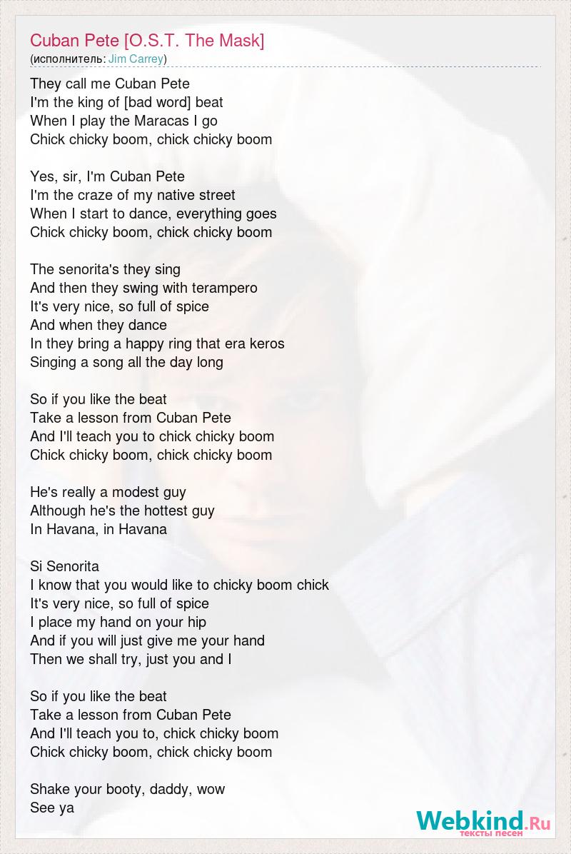 They call me Cuban Pete I'm the king of [bad word] beat When I play the Maracas I go Chick chicky boom, chick chicky boom Yes, sir, I'm Cuban Pete I'm the craze of my native street When I start to dance, everything goes Chick chicky boom, chick chicky boom The senorita's they sing And then they swing with terampero It's very nice, so full of spice And when they dance In they bring a happy ring that era keros Singing a song all the day long So if you like the beat Take a lesson from Cuban Pete And I'll teach you to chick chicky boom Chick chicky boom, chick chicky boom He's really a modest guy Although he's the hottest guy In Havana, in Havana Si Senorita I know that you would like to chicky boom chick It's very nice, so full of spice I place my hand on your hip And if you will just give me your hand Then we shall try, just you and I So if you like the beat Take a lesson from Cuban Pete And I'll teach you to, chick chicky boom Chick chicky boom, chick chicky boom Shake your booty, daddy, wow See ya