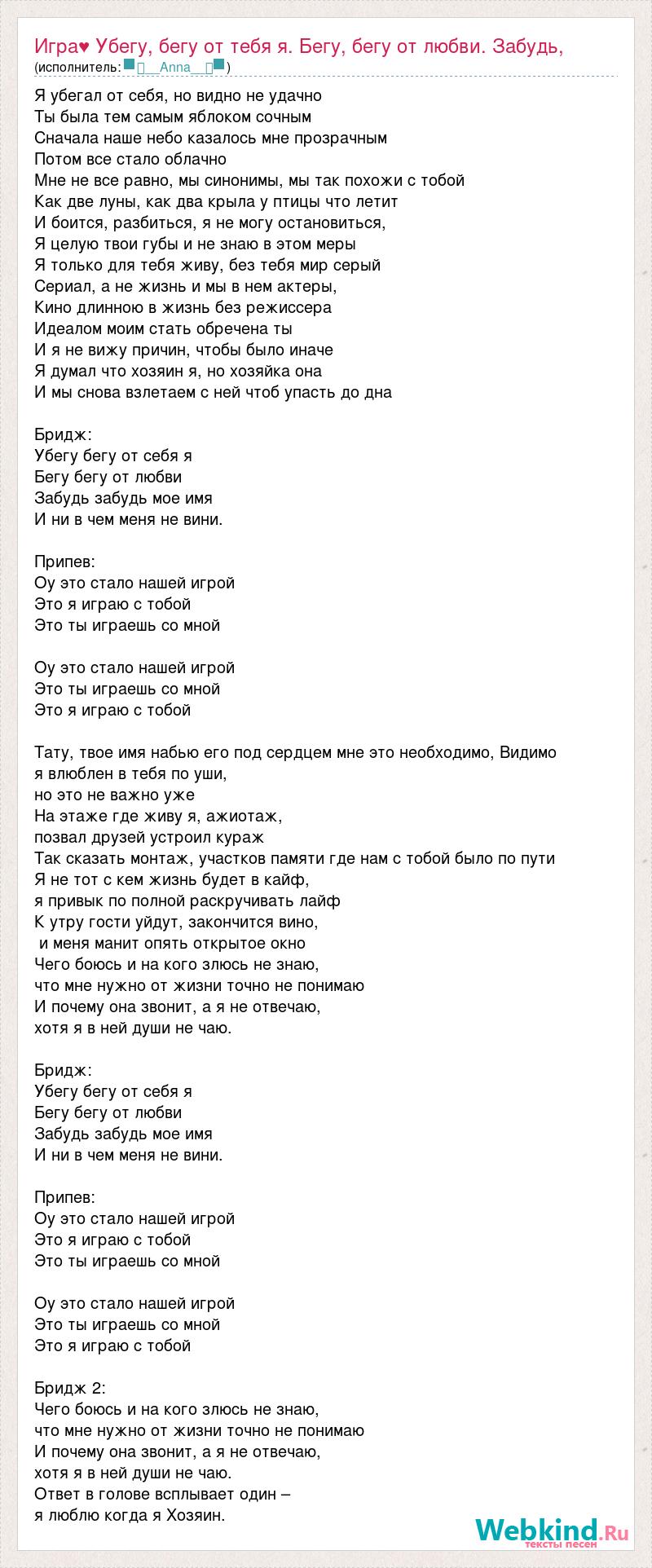 А как ты думаешь, о чем песня "Игра♥ Убегу, бегу от тебя я. Бегу, бегу от любви. Забудь, забудь мое имя, " ?