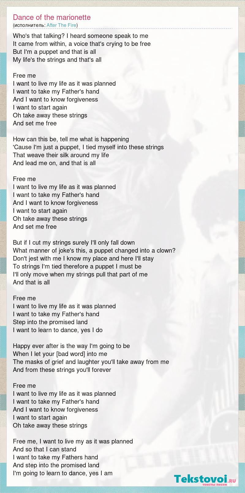 Who's that talking? I heard someone speak to me It came from within, a voice that's crying to be free But I'm a puppet and that is all My life's the strings and that's all Free me I want to live my life as it was planned I want to take my Father's hand And I want to know forgiveness I want to start again Oh take away these strings And set me free How can this be, tell me what is happening 'Cause I'm just a puppet, I tied myself into these strings That weave their silk around my life And lead me on, and that is all Free me I want to live my life as it was planned I want to take my Father's hand And I want to know forgiveness I want to start again Oh take away these strings And set me free But if I cut my strings surely I'll only fall down What manner of joke's this, a puppet changed into a clown? Don't jest with me I know my place and here I'll stay To strings I'm tied therefore a puppet I must be I'll only move when my strings pull that part of me And that is all Free me I want to live my life as it was planned I want to take my Father's hand Step into the promised land I want to learn to dance, yes I do Happy ever after is the way I'm going to be When I let your love come into me The masks of grief and laughter you'll take away from me And from these strings you'll forever Free me I want to live my life as it was planned I want to take my Father's hand And I want to know forgiveness I want to start again Oh take away these strings Free me, I want to live my as it was planned And so that I can stand I want to take my Fathers hand And step into the promised land I'm going to learn to dance, yes I am