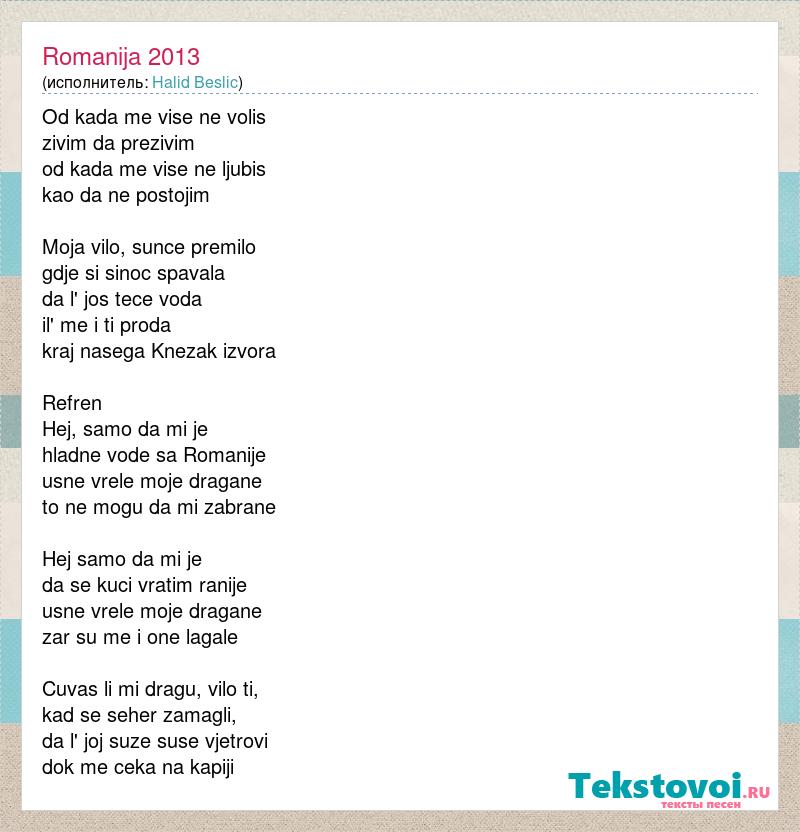 Od kada me vise ne volis zivim da prezivim od kada me vise ne ljubis kao da ne postojim Moja vilo, sunce premilo gdje si sinoc spavala da l' jos tece voda il' me i ti proda kraj nasega Knezak izvora Refren Hej, samo da mi je hladne vode sa Romanije usne vrele moje dragane to ne mogu da mi zabrane Hej samo da mi je da se kuci vratim ranije usne vrele moje dragane zar su me i one lagale Cuvas li mi dragu, vilo ti, kad se seher zamagli, da l' joj suze suse vjetrovi dok me ceka na kapiji