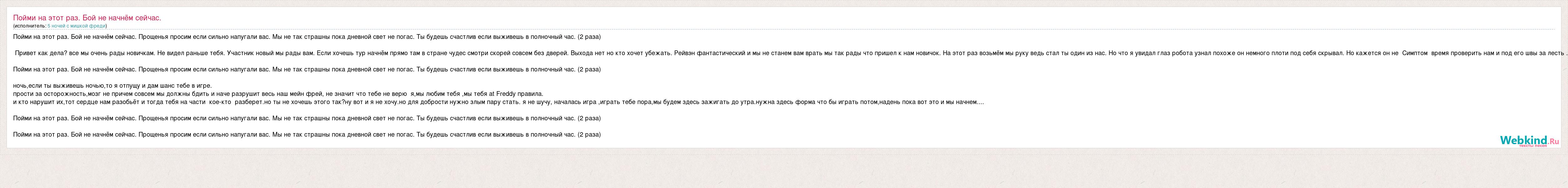 Пойми на этот раз. Бой не начнём сейчас. Прощенья просим если сильно напугали вас. Мы не так страшны пока дневной свет не погас. Ты будешь счастлив если выживешь в полночный час. (2 раза) Привет как дела? все мы очень рады новичкам. Не видел раньше тебя. Участник новый мы рады вам. Если хочешь тур начнём прямо там в стране чудес смотри скорей совсем без дверей. Выхода нет но кто хочет убежать. Рейвэн фантастический и мы не станем вам врать мы так рады что пришел к нам новичок. На этот раз возьмём мы руку ведь стал ты один из нас. Но что я увидал глаз робота узнал похоже он немного плоти под себя скрывал. Но кажется он не Симптом время проверить нам и под его швы за лесть . Пойми на этот раз. Бой не начнём сейчас. Прощенья просим если сильно напугали вас. Мы не так страшны пока дневной свет не погас. Ты будешь счастлив если выживешь в полночный час. (2 раза) ночь,если ты выживешь ночью,то я отпущу и дам шанс тебе в игре. прости за осторожность,мозг не причем совсем мы должны бдить и наче разрушит весь наш мейн фрей, не значит что тебе не верю я,мы любим тебя ,мы тебя at Freddy правила. и кто нарушит их,тот сердце нам разобьёт и тогда тебя на части кое-кто разберет.но ты не хочешь этого так?ну вот и я не хочу.но для добрости нужно злым пару стать. я не шучу, началась игра ,играть тебе пора,мы будем здесь зажигать до утра.нужна здесь форма что бы играть потом,надень пока вот это и мы начнем.... Пойми на этот раз. Бой не начнём сейчас. Прощенья просим если сильно напугали вас. Мы не так страшны пока дневной свет не погас. Ты будешь счастлив если выживешь в полночный час. (2 раза) Пойми на этот раз. Бой не начнём сейчас. Прощенья просим если сильно напугали вас. Мы не так страшны пока дневной свет не погас. Ты будешь счастлив если выживешь в полночный час. (2 раза)