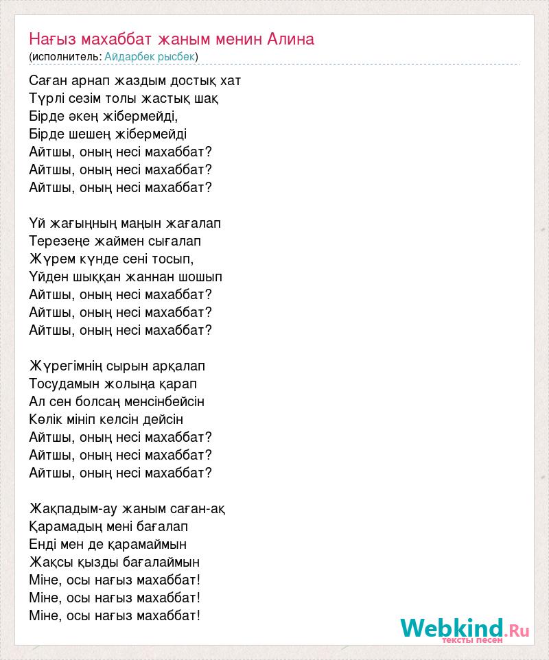 Саған арнап жаздым достық хат Түрлі сезім толы жастық шақ Бірде әкең жібермейді, Бірде шешең жібермейді Айтшы, оның несі махаббат? Айтшы, оның несі махаббат? Айтшы, оның несі махаббат? Үй жағыңның маңын жағалап Терезеңе жаймен сығалап Жүрем күнде сені тосып, Үйден шыққан жаннан шошып Айтшы, оның несі махаббат? Айтшы, оның несі махаббат? Айтшы, оның несі махаббат? Жүрегімнің сырын арқалап Тосудамын жолыңа қарап Ал сен болсаң менсінбейсін Көлік мініп келсін дейсін Айтшы, оның несі махаббат? Айтшы, оның несі махаббат? Айтшы, оның несі махаббат? Жақпадым-ау жаным саған-ақ Қарамадың мені бағалап Енді мен де қарамаймын Жақсы қызды бағалаймын Міне, осы нағыз махаббат! Міне, осы нағыз махаббат! Міне, осы нағыз махаббат!