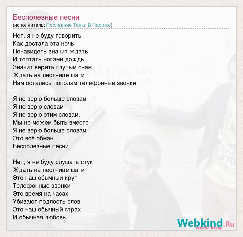 Нет, я не буду говорить Как достала эта ночь Ненавидеть значит ждать И топтать ногами дождь Значит верить глупым снам Ждать на лестнице шаги Нам остались пополам телефонные звонки Я не верю больше словам Я не верю словам Я не верю этим словам, Мы не можем быть вместе Я не верю больше словам Это всё обман Бесполезные песни Нет, я не буду слушать стук Ждать на лестнице шаги Это наш обычный круг Телефонные звонки Это время на часах Убивают подлость слов Это наш обычный страх И обычная любовь