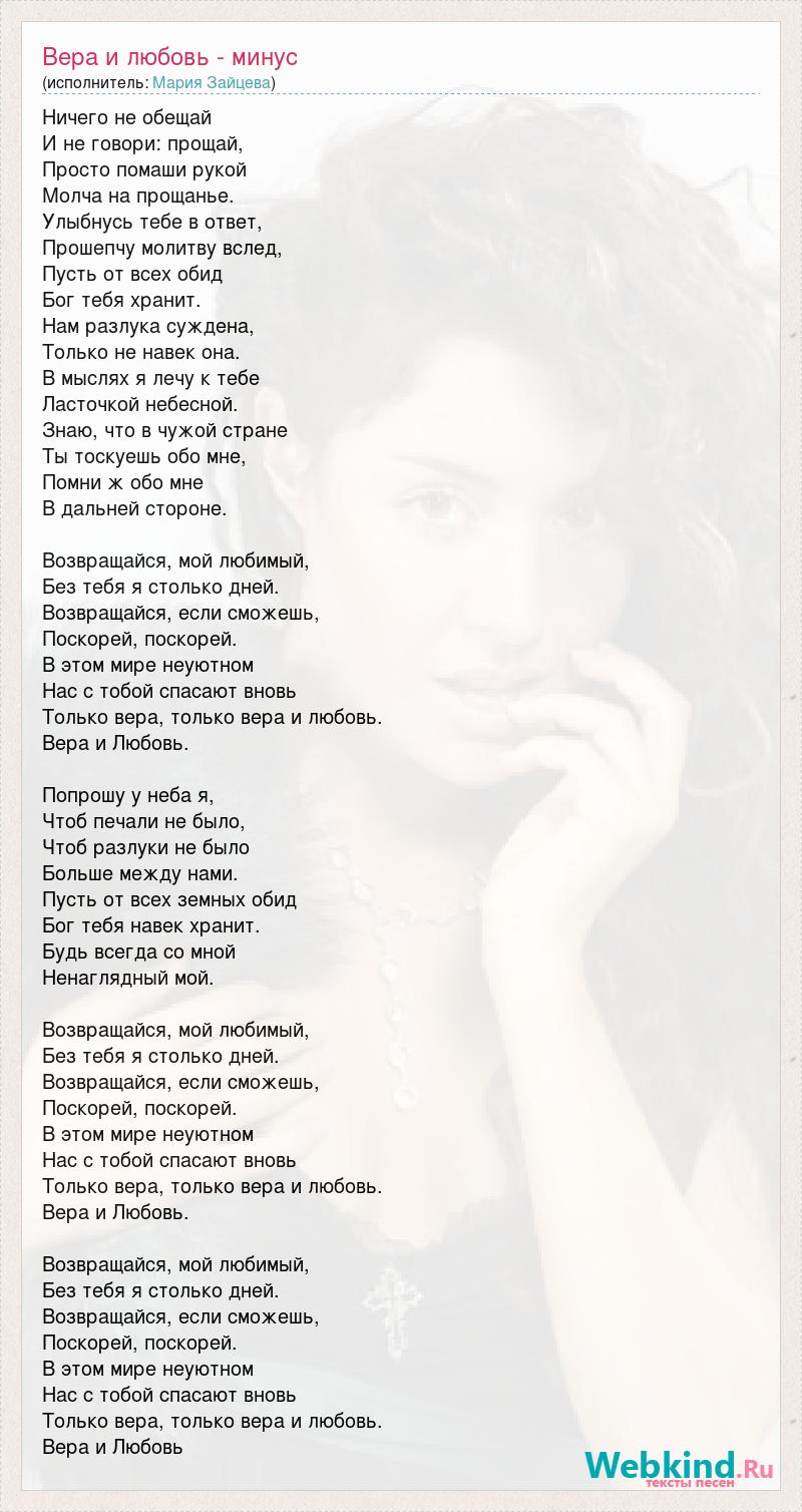 Ничего не обещай И не говори: прощай, Просто помаши рукой Молча на прощанье. Улыбнусь тебе в ответ, Прошепчу молитву вслед, Пусть от всех обид Бог тебя хранит. Нам разлука суждена, Только не навек она. В мыслях я лечу к тебе Ласточкой небесной. Знаю, что в чужой стране Ты тоскуешь обо мне, Помни ж обо мне В дальней стороне. Возвращайся, мой любимый, Без тебя я столько дней. Возвращайся, если сможешь, Поскорей, поскорей. В этом мире неуютном Нас с тобой спасают вновь Только вера, только вера и любовь. Вера и Любовь. Попрошу у неба я, Чтоб печали не было, Чтоб разлуки не было Больше между нами. Пусть от всех земных обид Бог тебя навек хранит. Будь всегда со мной Ненаглядный мой. Возвращайся, мой любимый, Без тебя я столько дней. Возвращайся, если сможешь, Поскорей, поскорей. В этом мире неуютном Нас с тобой спасают вновь Только вера, только вера и любовь. Вера и Любовь. Возвращайся, мой любимый, Без тебя я столько дней. Возвращайся, если сможешь, Поскорей, поскорей. В этом мире неуютном Нас с тобой спасают вновь Только вера, только вера и любовь. Вера и Любовь