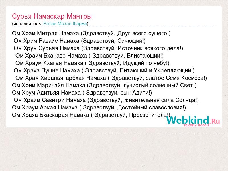 Ом Храм Митрая Намаха (Здравствуй, Друг всего сущего!) Ом Хрим Равайе Намаха (Здравствуй, Сияющий!) Ом Хрум Сурьяя Намаха (Здравствуй, Источник всякого дела!) Ом Храим Бханаве Намаха ( Здравствуй, Блистающий!) Ом Храум Кхагая Намаха ( Здравствуй, Идущий по небу!) Ом Храха Пушне Намаха ( Здравствуй, Питающий и Укрепляющий!) Ом Храм Хираньягарбхая Намаха ( Здравствуй, златое Семя Космоса!) Ом Хрим Маричайя Намаха (Здравствуй, лучистый солнечный Свет!) Ом Хрум Адитьяя Намаха ( Здравствуй, сын Адити!) Ом Храим Савитри Намаха (Здравствуй, живительная сила Солнца!) Ом Храум Аркая Намаха ( Здравствуй, Достойный славословия!) Ом Храха Бхаскарая Намаха ( Здравствуй, Просветитель!)