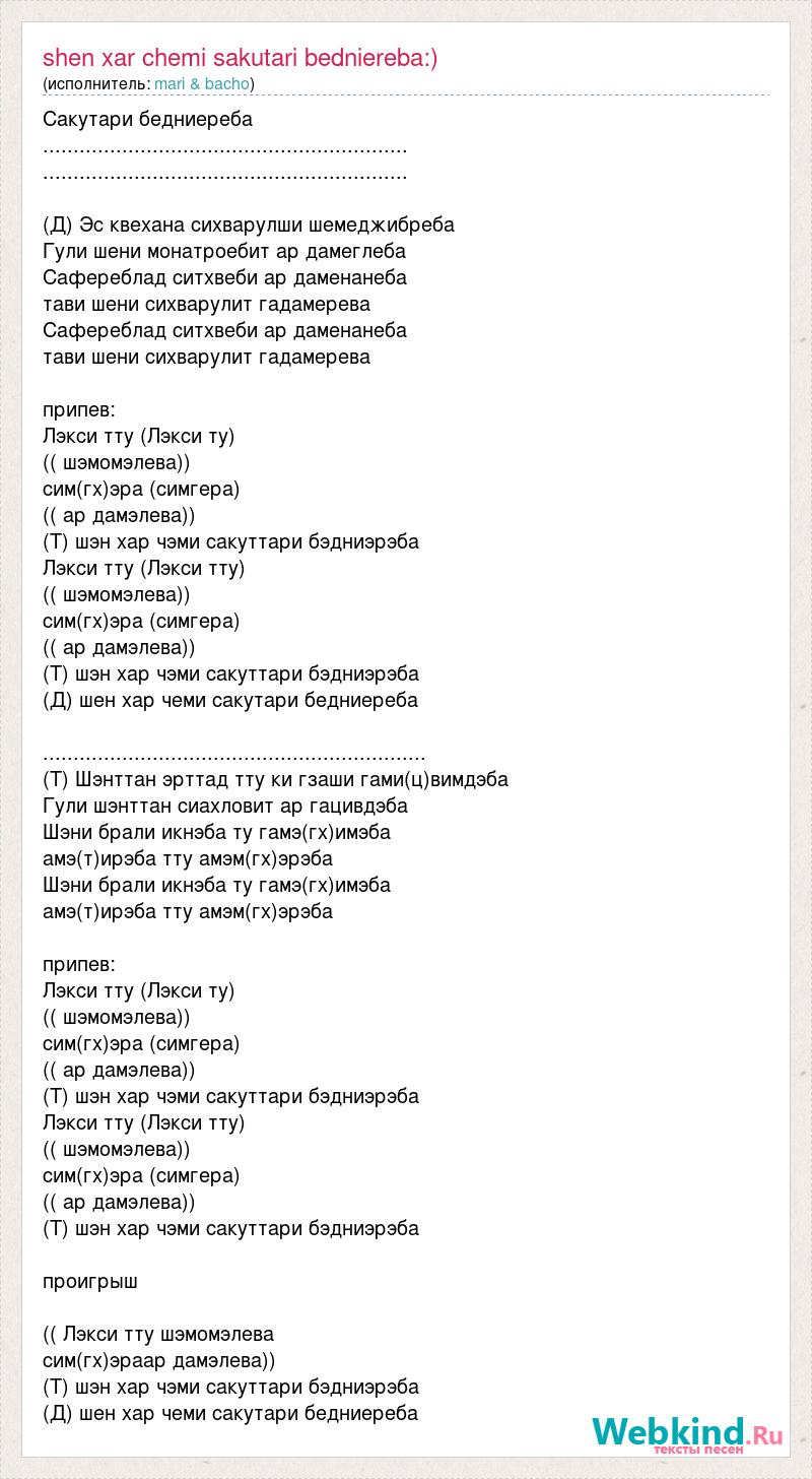 Сакутари бедниереба ............................................................ ............................................................ (Д) Эс квехана сихварулши шемеджибреба Гули шени монатроебит ар дамеглеба Сафереблад ситхвеби ар даменанеба тави шени сихварулит гадамерева Сафереблад ситхвеби ар даменанеба тави шени сихварулит гадамерева припев: Лэкси тту (Лэкси ту) (( шэмомэлева)) сим(гх)эра (симгера) (( ар дамэлева)) (Т) шэн хар чэми сакуттари бэдниэрэба Лэкси тту (Лэкси тту) (( шэмомэлева)) сим(гх)эра (симгера) (( ар дамэлева)) (Т) шэн хар чэми сакуттари бэдниэрэба (Д) шен хар чеми сакутари бедниереба ............................................................... (Т) Шэнттан эрттад тту ки гзаши гами(ц)вимдэба Гули шэнттан сиахловит ар гацивдэба Шэни брали икнэба ту гамэ(гх)имэба амэ(т)ирэба тту амэм(гх)эрэба Шэни брали икнэба ту гамэ(гх)имэба амэ(т)ирэба тту амэм(гх)эрэба припев: Лэкси тту (Лэкси ту) (( шэмомэлева)) сим(гх)эра (симгера) (( ар дамэлева)) (Т) шэн хар чэми сакуттари бэдниэрэба Лэкси тту (Лэкси тту) (( шэмомэлева)) сим(гх)эра (симгера) (( ар дамэлева)) (Т) шэн хар чэми сакуттари бэдниэрэба проигрыш (( Лэкси тту шэмомэлева сим(гх)эраар дамэлева)) (Т) шэн хар чэми сакуттари бэдниэрэба (Д) шен хар чеми сакутари бедниереба