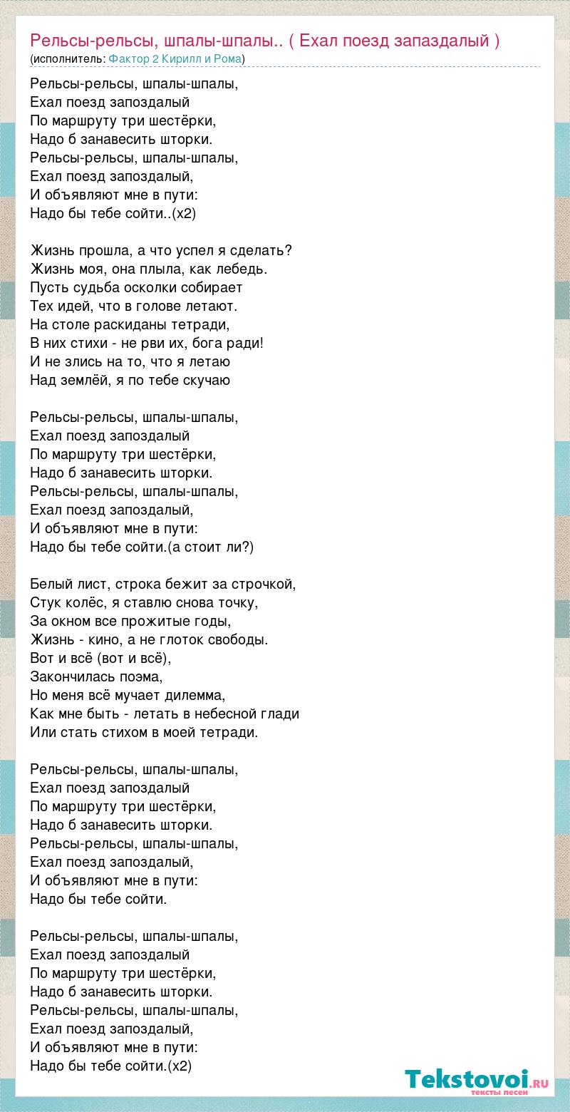 Рельсы-рельсы, шпалы-шпалы, Ехал поезд запоздалый По маршруту три шестёрки, Надо б занавесить шторки. Рельсы-рельсы, шпалы-шпалы, Ехал поезд запоздалый, И объявляют мне в пути: Надо бы тебе сойти..(x2) Жизнь прошла, а что успел я сделать? Жизнь моя, она плыла, как лебедь. Пусть судьба осколки собирает Тех идей, что в голове летают. На столе раскиданы тетради, В них стихи - не рви их, бога ради! И не злись на то, что я летаю Над землёй, я по тебе скучаю Рельсы-рельсы, шпалы-шпалы, Ехал поезд запоздалый По маршруту три шестёрки, Надо б занавесить шторки. Рельсы-рельсы, шпалы-шпалы, Ехал поезд запоздалый, И объявляют мне в пути: Надо бы тебе сойти.(а стоит ли?) Белый лист, строка бежит за строчкой, Стук колёс, я ставлю снова точку, За окном все прожитые годы, Жизнь - кино, а не глоток свободы. Вот и всё (вот и всё), Закончилась поэма, Но меня всё мучает дилемма, Как мне быть - летать в небесной глади Или стать стихом в моей тетради. Рельсы-рельсы, шпалы-шпалы, Ехал поезд запоздалый По маршруту три шестёрки, Надо б занавесить шторки. Рельсы-рельсы, шпалы-шпалы, Ехал поезд запоздалый, И объявляют мне в пути: Надо бы тебе сойти. Рельсы-рельсы, шпалы-шпалы, Ехал поезд запоздалый По маршруту три шестёрки, Надо б занавесить шторки. Рельсы-рельсы, шпалы-шпалы, Ехал поезд запоздалый, И объявляют мне в пути: Надо бы тебе сойти.(x2)