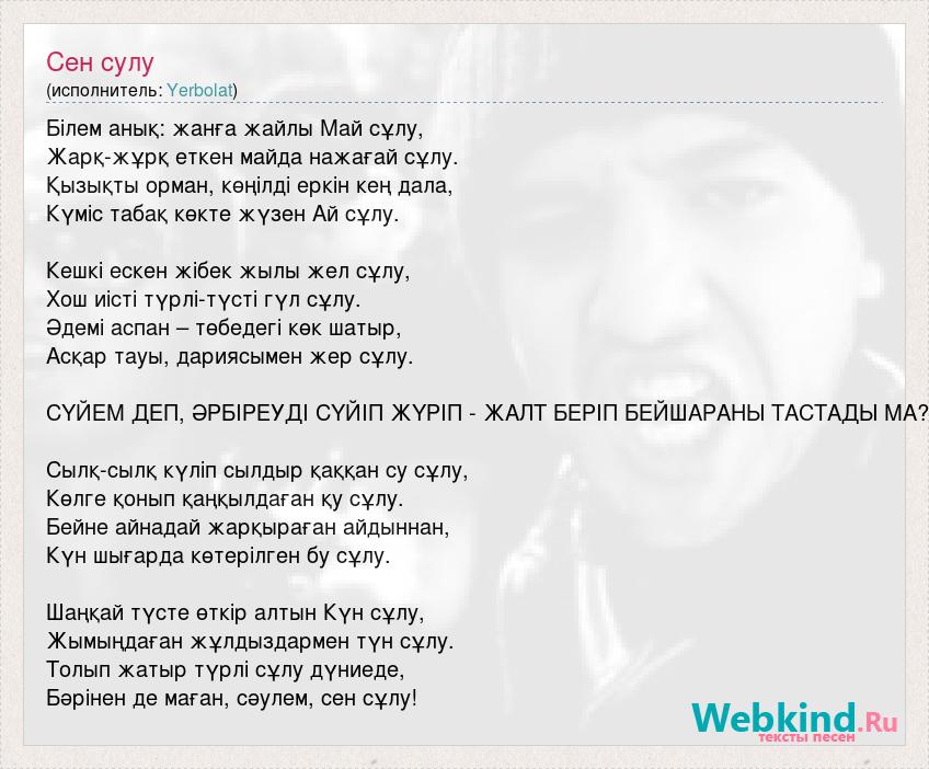 Білем анық: жанға жайлы Май сұлу, Жарқ-жұрқ еткен майда нажағай сұлу. Қызықты орман, көңілді еркін кең дала, Күміс табақ көкте жүзен Ай сұлу. Кешкі ескен жібек жылы жел сұлу, Хош иісті түрлі-түсті гүл сұлу. Әдемі аспан – төбедегі көк шатыр, Асқар тауы, дариясымен жер сұлу. СҮЙЕМ ДЕП, ӘРБІРЕУДІ СҮЙІП ЖҮРІП - ЖАЛТ БЕРІП БЕЙШАРАНЫ ТАСТАДЫ МА? Сылқ-сылқ күліп сылдыр қаққан су сұлу, Көлге қонып қаңқылдаған қу сұлу. Бейне айнадай жарқыраған айдыннан, Күн шығарда көтерілген бу сұлу. Шаңқай түсте өткір алтын Күн сұлу, Жымыңдаған жұлдыздармен түн сұлу. Толып жатыр түрлі сұлу дүниеде, Бәрінен де маған, сәулем, сен сұлу!