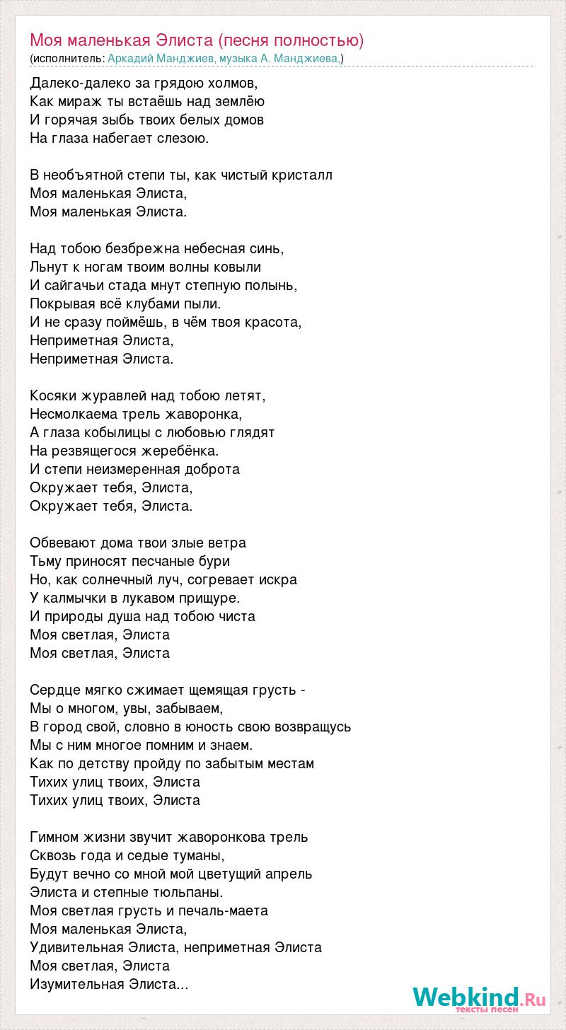 Далеко-далеко за грядою холмов, Как мираж ты встаёшь над землёю И горячая зыбь твоих белых домов На глаза набегает слезою. В необъятной степи ты, как чистый кристалл Моя маленькая Элиста, Моя маленькая Элиста. Над тобою безбрежна небесная синь, Льнут к ногам твоим волны ковыли И сайгачьи стада мнут степную полынь, Покрывая всё клубами пыли. И не сразу поймёшь, в чём твоя красота, Неприметная Элиста, Неприметная Элиста. Косяки журавлей над тобою летят, Несмолкаема трель жаворонка, А глаза кобылицы с любовью глядят На резвящегося жеребёнка. И степи неизмеренная доброта Окружает тебя, Элиста, Окружает тебя, Элиста. Обвевают дома твои злые ветра Тьму приносят песчаные бури Но, как солнечный луч, согревает искра У калмычки в лукавом прищуре. И природы душа над тобою чиста Моя светлая, Элиста Моя светлая, Элиста Сердце мягко сжимает щемящая грусть - Мы о многом, увы, забываем, В город свой, словно в юность свою возвращусь Мы с ним многое помним и знаем. Как по детству пройду по забытым местам Тихих улиц твоих, Элиста Тихих улиц твоих, Элиста Гимном жизни звучит жаворонкова трель Сквозь года и седые туманы, Будут вечно со мной мой цветущий апрель Элиста и степные тюльпаны. Моя светлая грусть и печаль-маета Моя маленькая Элиста, Удивительная Элиста, неприметная Элиста Моя светлая, Элиста Изумительная Элиста...