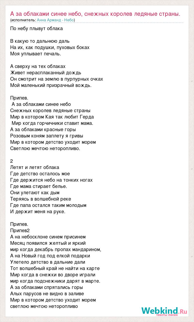 По небу плывут облака В какую то дальнюю даль На их, как подушки, пуховых боках Моя уплывает печаль. А сверху на тех облаках Живет нерасплаканный дождь Он смотрит на землю в пурпурных очках Мой маленький призрачный вождь. Припев. А за облаками синее небо Снежных королев ледяные страны Мир в котором Кая так любит Герда Мир когда горчичники ставит мама. А за облаками красные горы Розовым коням заплету я гривы Мир в котором детство уходит морем Светлою мечтою неторопливо. 2 Летят и летят облака Где детство осталось мое Где держится небо на тонких ногах Где мама стирает белье. Они улетают как дым Теряясь в волшебной реке Где папа остался таким молодым И держит меня на руке. Припев. Припев2 А на небосклоне синем присинем Месяц появился желтый и яркий мир когда декабрь пропах мандарином, А на Новый год под елкой подарки Улетело детство в дальние дали Тот волшебный край не найти на карте Мир когда в снежки во дворе играли мир когда подснежники дарят в марте. А за облаками спрятались горы Алых парусов не видно в заливе Мир в котором детство уходит морем светлою мечтою неторопливо