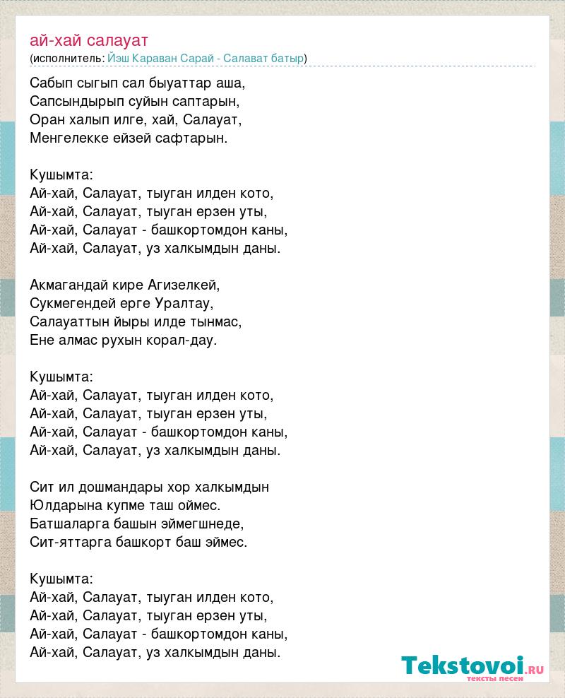 Сабып сыгып сал быуаттар аша, Сапсындырып суйын саптарын, Оран халып илге, хай, Салауат, Менгелекке ейзей сафтарын. Кушымта: Ай-хай, Салауат, тыуган илден кото, Ай-хай, Салауат, тыуган ерзен уты, Ай-хай, Салауат - башкортомдон каны, Ай-хай, Салауат, уз халкымдын даны. Акмагандай кире Агизелкей, Сукмегендей ерге Уралтау, Салауаттын йыры илде тынмас, Ене алмас рухын корал-дау. Кушымта: Ай-хай, Салауат, тыуган илден кото, Ай-хай, Салауат, тыуган ерзен уты, Ай-хай, Салауат - башкортомдон каны, Ай-хай, Салауат, уз халкымдын даны. Сит ил дошмандары хор халкымдын Юлдарына купме таш оймес. Батшаларга башын эймегшнеде, Сит-яттарга башкорт баш эймес. Кушымта: Ай-хай, Салауат, тыуган илден кото, Ай-хай, Салауат, тыуган ерзен уты, Ай-хай, Салауат - башкортомдон каны, Ай-хай, Салауат, уз халкымдын даны.