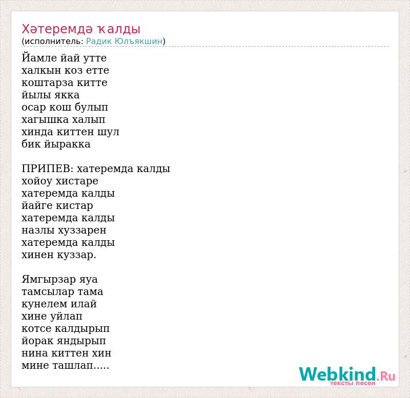 Йамле йай утте халкын коз етте коштарза китте йылы якка осар кош булып хагышка халып хинда киттен шул бик йыракка ПРИПЕВ: хатеремда калды хойоу хистаре хатеремда калды йайге кистар хатеремда калды назлы хуззарен хатеремда калды хинен куззар. Ямгырзар яуа тамсылар тама кунелем илай хине уйлап котсе калдырып йорак яндырып нина киттен хин мине ташлап.....