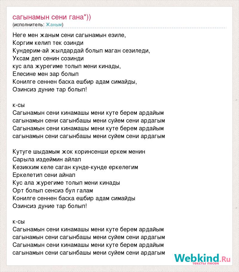 Неге мен жаным сени сагынамын езиле, Коргим келип тек озинди Кундерим-ай жылдардай болып маган сезиледи, Уксам деп сенин созинди кус ала журегиме толып мени кинады, Елесине мен зар болып Конилге сеннен баска ешбир адам симайды, Озинсиз дуние тар болып! к-сы Сагынамын сени кинамашы мени куте берем ардайым сагынамын сени сагынбашы мени суйем сени ардагым Сагынамын сени кинамашы мени куте берем ардайым сагынамын сени сагынбашы мени суйем сени ардагым Кутуге шыдамым жок коринсенши еркем менин Сарыла издеймин айлап Кезикким келе саган кунде-кунде еркелегим Еркелетип сени айнап Кус ала журегиме толып мени кинады Орт болып сенсиз бул галам Конилге сеннен баска ешбир адам симайды Озинсиз дуние тар болып! к-сы Сагынамын сени кинамашы мени куте берем ардайым сагынамын сени сагынбашы мени суйем сени ардагым Сагынамын сени кинамашы мени куте берем ардайым сагынамын сени сагынбашы мени суйем сени ардагым
