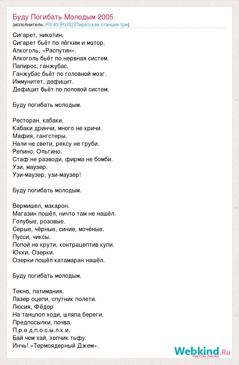 Сигарет, никотин. Сигарет бьёт по лёгким и мотор. Алкоголь, «Распутин». Алкоголь бьёт по нервная систем. Папирос, ганжубас. Ганжубас бьёт по головной мозг. Иммунитет, дефицит. Дефицит бьёт по половой систем. Буду погибать молодым. Ресторан, кабаки. Кабаки дринчи, много не кричи. Мафия, гангстеры. Нали не свети, рексу не груби. Репино, Ольгино. Стаф не разводи, фирма не бомби. Узи, маузер. Узи-маузер, узи-маузер! Буду погибать молодым. Вермишел, макарон. Магазин пошёл, ничто там не нашёл. Голубые, розовые. Серые, чёрные, синие, мочёные. Пусси, чиксы. Попой не крути, контрацептив купи. Юкки, Озерки. Озерки пошёл катамаран нашёл. Буду погибать молодым. Текно, патимания. Лазер оцепи, спутник полети. Люсия, Фёдор На танцпол ходи, шляпа береги. Предпосылки, почва. П.р.е.д.п.о.с.ы.л.к.и. Бай чем хай, хопчик тьфу. Инчь! «Термоядерный Джем».