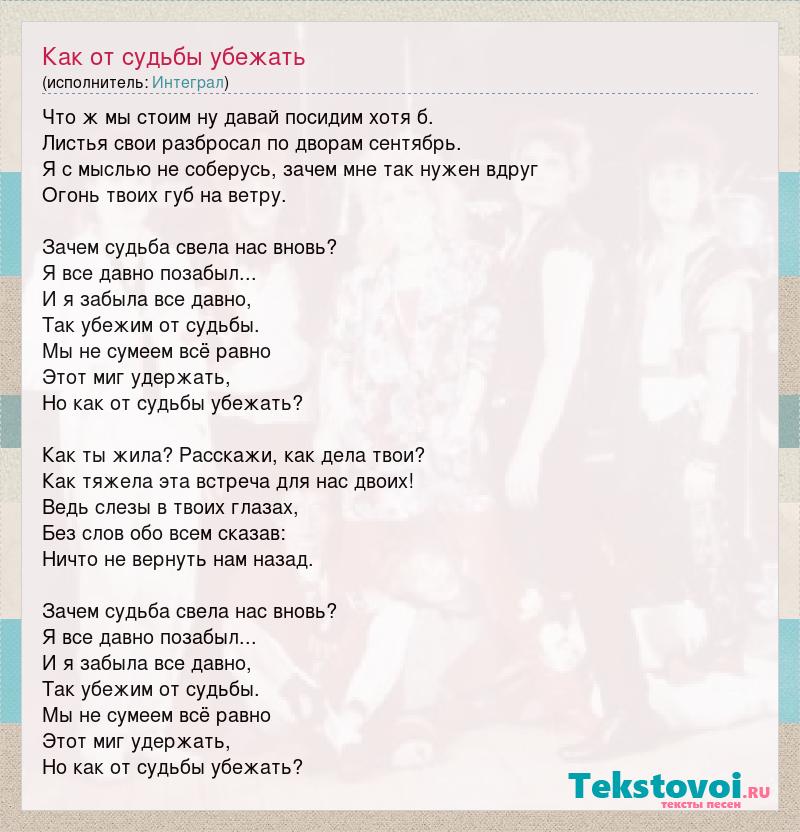 Что ж мы стоим ну давай посидим хотя б. Листья свои разбросал по дворам сентябрь. Я с мыслью не соберусь, зачем мне так нужен вдруг Огонь твоих губ на ветру. Зачем судьба свела нас вновь? Я все давно позабыл... И я забыла все давно, Так убежим от судьбы. Мы не сумеем всё равно Этот миг удержать, Но как от судьбы убежать? Как ты жила? Расскажи, как дела твои? Как тяжела эта встреча для нас двоих! Ведь слезы в твоих глазах, Без слов обо всем сказав: Ничто не вернуть нам назад. Зачем судьба свела нас вновь? Я все давно позабыл... И я забыла все давно, Так убежим от судьбы. Мы не сумеем всё равно Этот миг удержать, Но как от судьбы убежать?
