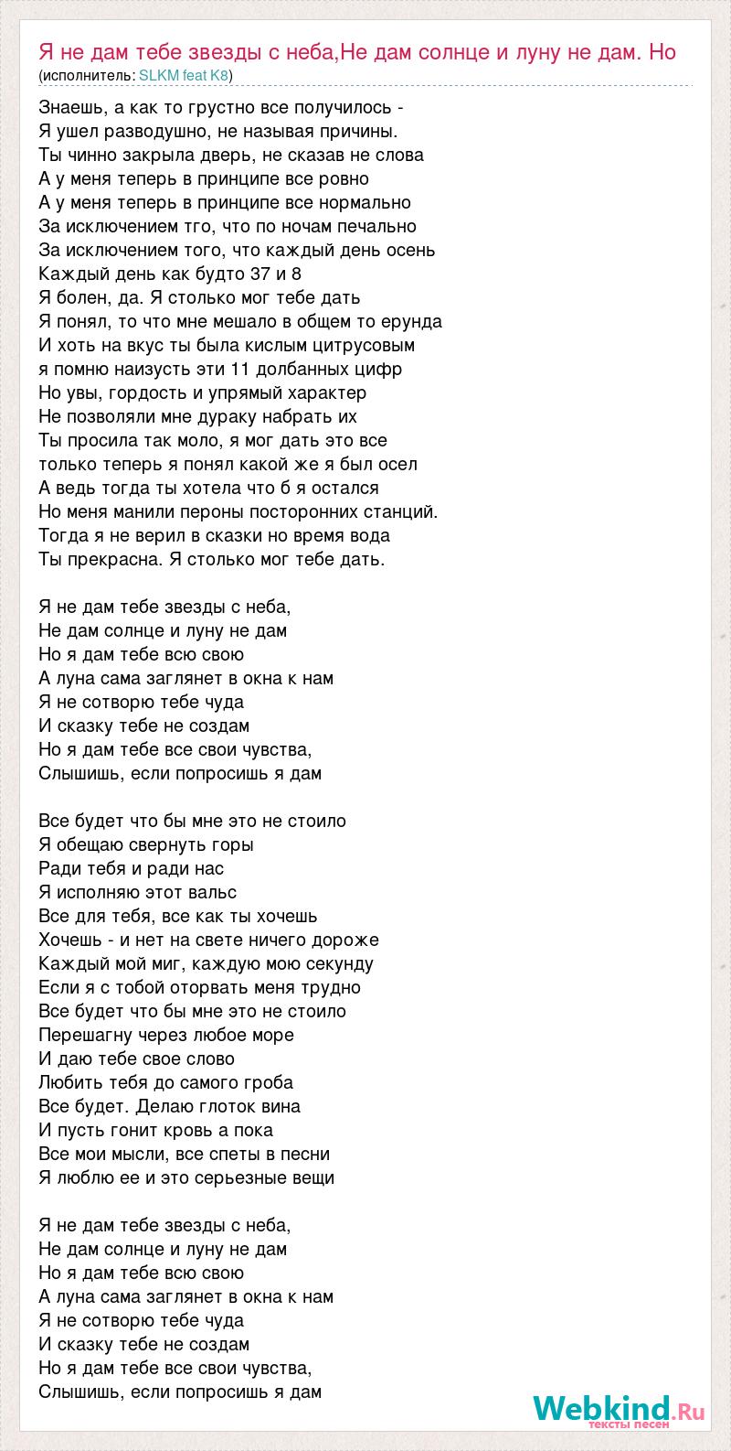 Знаешь, а как то грустно все получилось - Я ушел разводушно, не называя причины. Ты чинно закрыла дверь, не сказав не слова А у меня теперь в принципе все ровно А у меня теперь в принципе все нормально За исключением тго, что по ночам печально За исключением того, что каждый день осень Каждый день как будто 37 и 8 Я болен, да. Я столько мог тебе дать Я понял, то что мне мешало в общем то ерунда И хоть на вкус ты была кислым цитрусовым я помню наизусть эти 11 долбанных цифр Но увы, гордость и упрямый характер Не позволяли мне дураку набрать их Ты просила так моло, я мог дать это все только теперь я понял какой же я был осел А ведь тогда ты хотела что б я остался Но меня манили пероны посторонних станций. Тогда я не верил в сказки но время вода Ты прекрасна. Я столько мог тебе дать. Я не дам тебе звезды с неба, Не дам солнце и луну не дам Но я дам тебе всю свою А луна сама заглянет в окна к нам Я не сотворю тебе чуда И сказку тебе не создам Но я дам тебе все свои чувства, Слышишь, если попросишь я дам Все будет что бы мне это не стоило Я обещаю свернуть горы Ради тебя и ради нас Я исполняю этот вальс Все для тебя, все как ты хочешь Хочешь - и нет на свете ничего дороже Каждый мой миг, каждую мою секунду Если я с тобой оторвать меня трудно Все будет что бы мне это не стоило Перешагну через любое море И даю тебе свое слово Любить тебя до самого гроба Все будет. Делаю глоток вина И пусть гонит кровь а пока Все мои мысли, все спеты в песни Я люблю ее и это серьезные вещи Я не дам тебе звезды с неба, Не дам солнце и луну не дам Но я дам тебе всю свою А луна сама заглянет в окна к нам Я не сотворю тебе чуда И сказку тебе не создам Но я дам тебе все свои чувства, Слышишь, если попросишь я дам