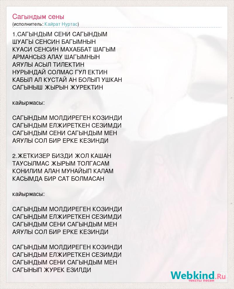 1.САГЫНДЫМ СЕНИ САГЫНДЫМ ШУАГЫ СЕНСИН БАГЫМНЫН КУАСИ СЕНСИН МАХАББАТ ШАГЫМ АРМАНСЫЗ АЛАУ ШАГЫМНЫН АЯУЛЫ АСЫЛ ТИЛЕКТИН НУРЫНДАЙ СОЛМАС ГУЛ ЕКТИН КАБЫЛ АЛ КУСТАЙ АН БОЛЫП УШКАН САГЫНЫШ ЖЫРЫН ЖУРЕКТИН кайырмасы: САГЫНДЫМ МОЛДИРЕГЕН КОЗИНДИ САГЫНДЫМ ЕЛЖИРЕТКЕН СЕЗИМДИ САГЫНДЫМ СЕНИ САГЫНДЫМ МЕН АЯУЛЫ СОЛ БИР ЕРКЕ КЕЗИНДИ 2.ЖЕТКИЗЕР БИЗДИ ЖОЛ КАШАН ТАУСЫЛМАС ЖЫРЫМ ТОЛГАСАМ КОНИЛИМ АЛАН МУНАЙЫП КАЛАМ КАСЫМДА БИР САТ БОЛМАСАН кайырмасы: САГЫНДЫМ МОЛДИРЕГЕН КОЗИНДИ САГЫНДЫМ ЕЛЖИРЕТКЕН СЕЗИМДИ САГЫНДЫМ СЕНИ САГЫНДЫМ МЕН АЯУЛЫ СОЛ БИР ЕРКЕ КЕЗИНДИ САГЫНДЫМ МОЛДИРЕГЕН КОЗИНДИ САГЫНДЫМ ЕЛЖИРЕТКЕН СЕЗИМДИ САГЫНДЫМ СЕНИ САГЫНДЫМ МЕН САГЫНЫП ЖУРЕК ЕЗИЛДИ