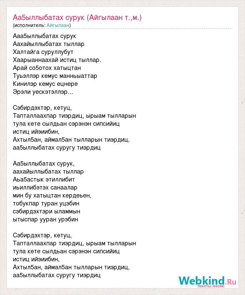 Ааа5ыллыбатах сурук Аахайыллыбатах тыллар Халтайга суруллубут Хаарыаннаахай истиц тыллар. Арай со5отох хатыцтан Туьэллэр кемус манньыаттар Кинилэр кемус ецнере Эрэли уескэтэллэр... Сэбирдэхтэр, кетуц, Тапталлаахпар тиэрдиц, ырыам тылларын тула кете сылдьан сэрэнэн сипсийиц истиц ийэиибин, Ахтыл5ан, аймал5ан тылларын тиэрдиц, аа5ыллыбатах суругу тиэрдиц Аа5ыллыбатах сурук, аахайыллыбатах тыллар Аьа5астык этиллибит иьиллибэтэх санаалар мин бу хатыцтан кердеьен, тобукпар туран уцэбин сэбирдэхтэри ыламмын ытыспар ууран урэбин Сэбирдэхтэр, кетуц, Тапталлаахпар тиэрдиц, ырыам тылларын тула кете сылдьан сэрэнэн сипсийиц истиц ийэиибин, Ахтыл5ан, аймал5ан тылларын тиэрдиц, аа5ыллыбатах суругу тиэрдиц