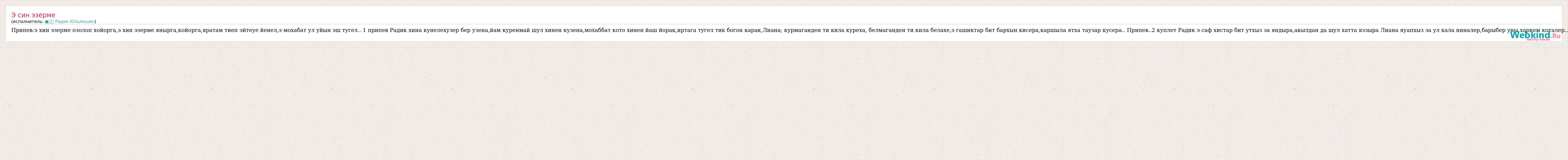 Припев:э хин эзерме озолоп хойорга,э хин эзерме янырга,койорга,яратам тиеп эйтеуе йенел,э мохабат ул уйын эш тугел.. 1 припев Радик хина кунелехузер бер узена,йам куренмай шул хинен кузена,мохаббат кото хинен йаш йорак,иртага тугел тик богон карак,Лиана; курмаганден ти кила куреха, белмаганден ти кила белахе,э гашиктар бит бархын кисера,каршыла ятха таузар кусера.. Припев..2 куплет Радик э саф хистар бит утхыз за яндыра,акылдан да шул хатта яззыра Лиана яуапхыз за ул кала ниналер,барыбер уны харкем коталер..