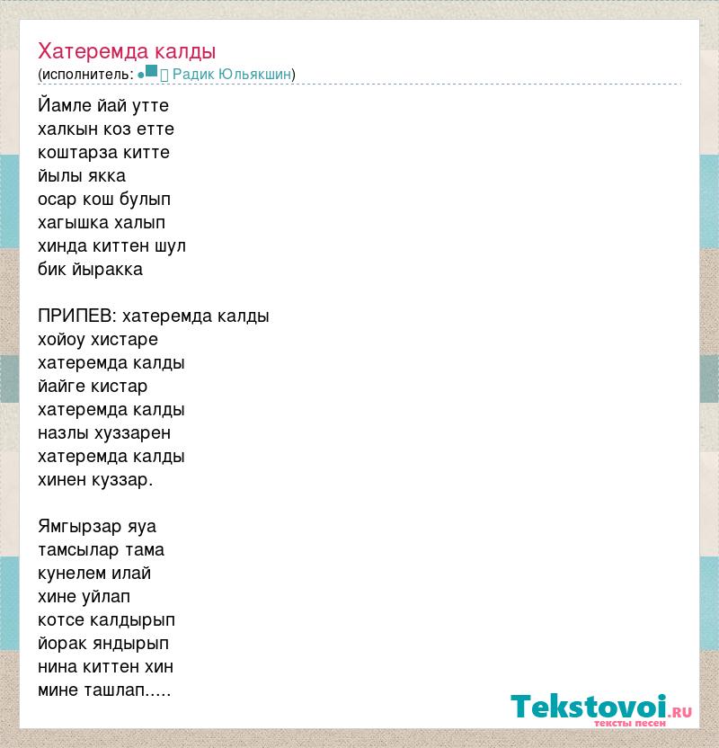 Йамле йай утте халкын коз етте коштарза китте йылы якка осар кош булып хагышка халып хинда киттен шул бик йыракка ПРИПЕВ: хатеремда калды хойоу хистаре хатеремда калды йайге кистар хатеремда калды назлы хуззарен хатеремда калды хинен куззар. Ямгырзар яуа тамсылар тама кунелем илай хине уйлап котсе калдырып йорак яндырып нина киттен хин мине ташлап.....