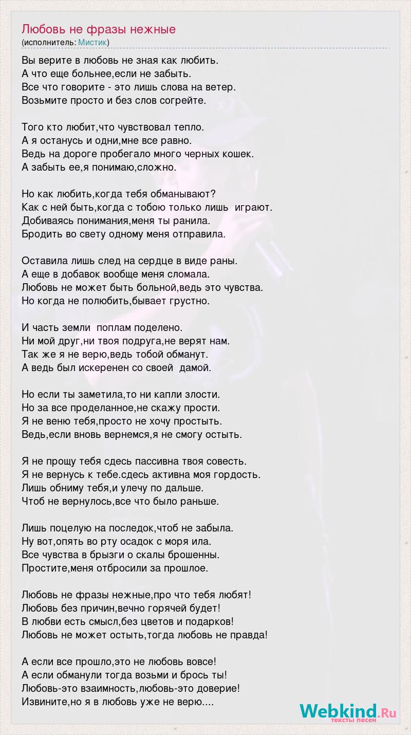 Вы верите в любовь не зная как любить. А что еще больнее,если не забыть. Все что говорите - это лишь слова на ветер. Возьмите просто и без слов согрейте. Того кто любит,что чувствовал тепло. А я останусь и одни,мне все равно. Ведь на дороге пробегало много черных кошек. А забыть ее,я понимаю,сложно. Но как любить,когда тебя обманывают? Как с ней быть,когда с тобою только лишь играют. Добиваясь понимания,меня ты ранила. Бродить во свету одному меня отправила. Оставила лишь след на сердце в виде раны. А еще в добавок вообще меня сломала. Любовь не может быть больной,ведь это чувства. Но когда не полюбить,бывает грустно. И часть земли поплам поделено. Ни мой друг,ни твоя подруга,не верят нам. Так же я не верю,ведь тобой обманут. А ведь был искеренен со своей дамой. Но если ты заметила,то ни капли злости. Но за все проделанное,не скажу прости. Я не веню тебя,просто не хочу простыть. Ведь,если вновь вернемся,я не смогу остыть. Я не прощу тебя сдесь пассивна твоя совесть. Я не вернусь к тебе.сдесь активна моя гордость. Лишь обниму тебя,и улечу по дальше. Чтоб не вернулось,все что было раньше. Лишь поцелую на последок,чтоб не забыла. Ну вот,опять во рту осадок с моря ила. Все чувства в брызги о скалы брошенны. Простите,меня отбросили за прошлое. Любовь не фразы нежные,про что тебя любят! Любовь без причин,вечно горячей будет! В любви есть смысл,без цветов и подарков! Любовь не может остыть,тогда любовь не правда! А если все прошло,это не любовь вовсе! А если обманули тогда возьми и брось ты! Любовь-это взаимность,любовь-это доверие! Извините,но я в любовь уже не верю....