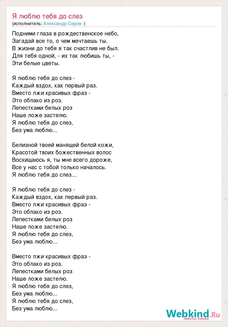 Подними глаза в рождественское небо, Загадай все то, о чем мечтаешь ты. В жизни до тебя я так счастлив не был. Для тебя одной, - их так любишь ты, - Эти белые цветы. Я люблю тебя до слез - Каждый вздох, как первый раз. Вместо лжи красивых фраз - Это облако из роз. Лепестками белых роз Наше ложе застелю. Я люблю тебя до слез, Без ума люблю... Белизной твоей манящей белой кожи, Красотой твоих божественных волос Восхищаюсь я, ты мне всего дороже, Все у нас с тобой только началось. Я люблю тебя до слез... Я люблю тебя до слез - Каждый вздох, как первый раз. Вместо лжи красивых фраз - Это облако из роз. Лепестками белых роз Наше ложе застелю. Я люблю тебя до слез, Без ума люблю... Вместо лжи красивых фраз - Это облако из роз. Лепестками белых роз Наше ложе застелю. Я люблю тебя до слез, Без ума люблю... Я люблю тебя до слез, Без ума люблю...