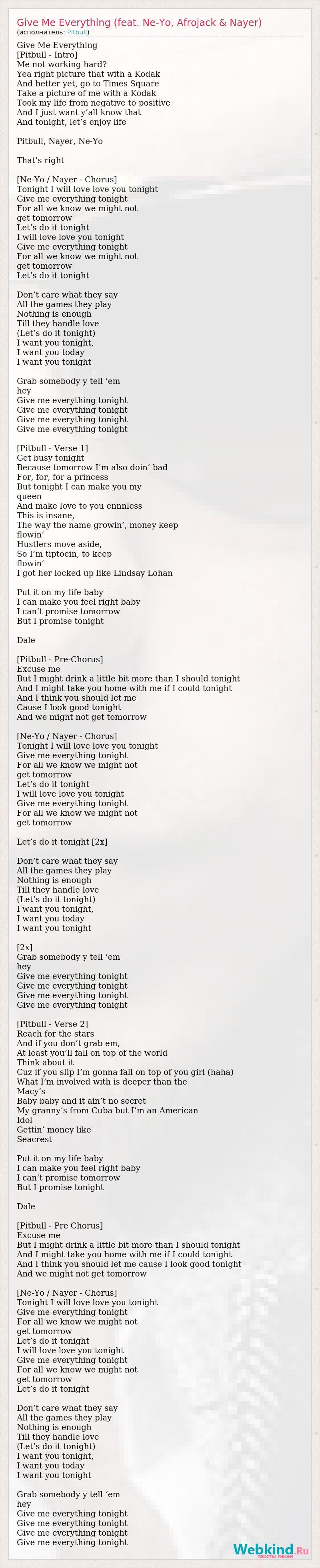 Give Me Everything [Pitbull - Intro] Me not working hard? Yea right picture that with a Kodak And better yet, go to Times Square Take a picture of me with a Kodak Took my life from negative to positive And I just want y’all know that And tonight, let’s enjoy life Pitbull, Nayer, Ne-Yo That’s right [Ne-Yo / Nayer - Chorus] Tonight I will love love you tonight Give me everything tonight For all we know we might not get tomorrow Let’s do it tonight I will love love you tonight Give me everything tonight For all we know we might not get tomorrow Let’s do it tonight Don’t care what they say All the games they play Nothing is enough Till they handle love (Let’s do it tonight) I want you tonight, I want you today I want you tonight Grab somebody y tell ‘em hey Give me everything tonight Give me everything tonight Give me everything tonight Give me everything tonight [Pitbull - Verse 1] Get busy tonight Because tomorrow I’m also doin’ bad For, for, for a princess But tonight I can make you my queen And make love to you ennnless This is insane, The way the name growin’, money keep flowin’ Hustlers move aside, So I’m tiptoein, to keep flowin’ I got her locked up like Lindsay Lohan Put it on my life baby I can make you feel right baby I can’t promise tomorrow But I promise tonight Dale [Pitbull - Pre-Chorus] Excuse me But I might drink a little bit more than I should tonight And I might take you home with me if I could tonight And I think you should let me Cause I look good tonight And we might not get tomorrow [Ne-Yo / Nayer - Chorus] Tonight I will love love you tonight Give me everything tonight For all we know we might not get tomorrow Let’s do it tonight I will love love you tonight Give me everything tonight For all we know we might not get tomorrow Let’s do it tonight [2x] Don’t care what they say All the games they play Nothing is enough Till they handle love (Let’s do it tonight) I want you tonight, I want you today I want you tonight [2x] Grab somebody y tell ‘em hey Give me everything tonight Give me everything tonight Give me everything tonight Give me everything tonight [Pitbull - Verse 2] Reach for the stars And if you don’t grab em, At least you’ll fall on top of the world Think about it Cuz if you slip I’m gonna fall on top of you girl (haha) What I’m involved with is deeper than the Macy’s Baby baby and it ain’t no secret My granny’s from Cuba but I’m an American Idol Gettin’ money like Seacrest Put it on my life baby I can make you feel right baby I can’t promise tomorrow But I promise tonight Dale [Pitbull - Pre Chorus] Excuse me But I might drink a little bit more than I should tonight And I might take you home with me if I could tonight And I think you should let me cause I look good tonight And we might not get tomorrow [Ne-Yo / Nayer - Chorus] Tonight I will love love you tonight Give me everything tonight For all we know we might not get tomorrow Let’s do it tonight I will love love you tonight Give me everything tonight For all we know we might not get tomorrow Let’s do it tonight Don’t care what they say All the games they play Nothing is enough Till they handle love (Let’s do it tonight) I want you tonight, I want you today I want you tonight Grab somebody y tell ‘em hey Give me everything tonight Give me everything tonight Give me everything tonight Give me everything tonight