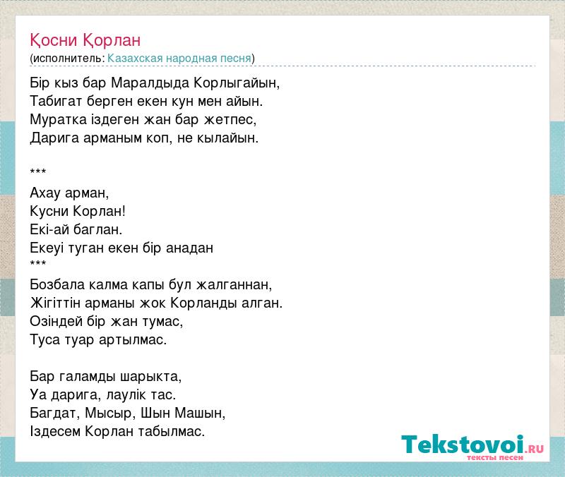 Бiр кыз бар Маралдыда Корлыгайын, Табигат берген екен кун мен айын. Муратка iздеген жан бар жетпес, Дарига арманым коп, не кылайын. *** Ахау арман, Кусни Корлан! Екi-ай баглан. Екеуi туган екен бiр анадан *** Бозбала калма капы бул жалганнан, Жiгiттiн арманы жок Корланды алган. Озiндей бiр жан тумас, Туса туар артылмас. Бар галамды шарыкта, Уа дарига, лаулiк тас. Багдат, Мысыр, Шын Машын, Iздесем Корлан табылмас.