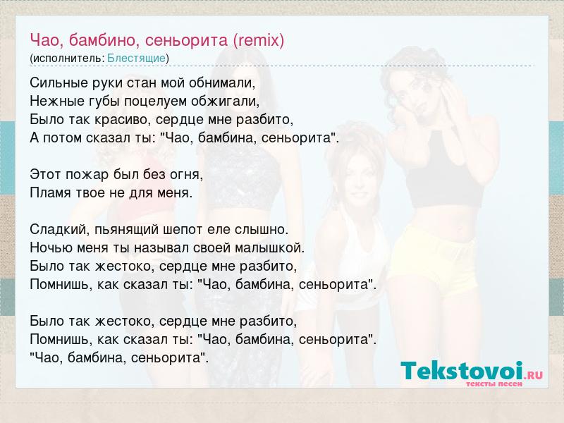 Сильные руки стан мой обнимали, Нежные губы поцелуем обжигали, Было так красиво, сердце мне разбито, А потом сказал ты: "Чао, бамбина, сеньорита". Этот пожар был без огня, Пламя твое не для меня. Сладкий, пьянящий шепот еле слышно. Ночью меня ты называл своей малышкой. Было так жестоко, сердце мне разбито, Помнишь, как сказал ты: "Чао, бамбина, сеньорита". Было так жестоко, сердце мне разбито, Помнишь, как сказал ты: "Чао, бамбина, сеньорита". "Чао, бамбина, сеньорита".