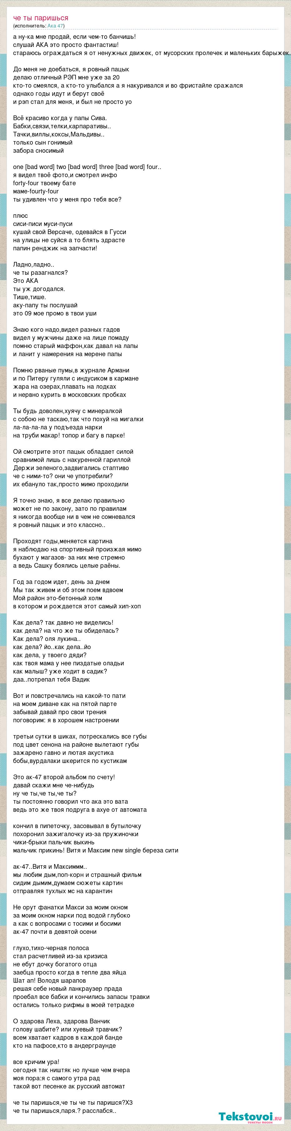 а ну-ка мне продай, если чем-то банчишь! слушай АКА это просто фантастиш! стараюсь ограждаться я от ненужных движек, от мусорских пролечек и маленьких барыжек. До меня не доебаться, я ровный пацык делаю отличный РЭП мне уже за 20 кто-то смеялся, а кто-то улыбался а я накуривался и во фристайле сражался однако годы идут и берут своё и рэп стал для меня, и был не просто yo Всё красиво когда у папы Сива. Бабки,связи,телки,карпаративы.. Тачки,виллы,коксы,Мальдивы.. только сын гонимый забора сносимый one [bad word] two [bad word] three [bad word] four.. я видел твоё фото,и смотрел инфо forty-four твоему бате маме-fourty-four ты удивлен что у меня про тебя все? плюс сиси-писи муси-пуси кушай свой Версаче, одевайся в Гусси на улицы не суйся а то блять здрасте папин ренджик на запчасти! Ладно,ладно.. че ты разагнался? Это АКА ты уж догодался. Тише,тише. аку-папу ты послушай это 09 мое промо в твои уши Знаю кого надо,видел разных гадов видел у мужчины даже на лице помаду помню старый маффон,как давал на лапы и ланит у намерения на мерене папы Помню рваные пумы,в журнале Армани и по Питеру гуляли с индусиком в кармане жара на озерах,плавать на лодках и нервно курить в московских пробках Ты будь доволен,хуячу с минералкой с собою не таскаю,так что похуй на мигалки ла-ла-ла-ла у подъезда нарки на труби макар! топор и багу в парке! Ой смотрите этот пацык обладает силой сравнимой лишь с накуренной гариллой Держи зеленого,задвигались стаптиво че с ними-то? они че употребили? их ебануло так,просто мимо проходили Я точно знаю, я все делаю правильно может не по закону, зато по правилам я никогда вообще ни в чем не сомневался я ровный пацык и это классно.. Проходят годы,меняется картина я наблюдаю на спортивный произжая мимо бухают у магазов- за них мне стремно а ведь Сашку боялись целые раёны. Год за годом идет, день за днем Мы так живем и об этом поем вдвоем Мой район это-бетонный холм в котором и рождается этот самый хип-хоп Как дела? так давно не виделись! как дела? на что же ты обиделась? Как дела? оля лукина.. как дела? йо..как дела..йо как дела, у твоего дяди? как твоя мама у нее пиздатые оладьи как малыш? уже ходит в садик? даа..потрепал тебя Вадик Вот и повстречались на какой-то пати на моем диване как на пятой парте забывай давай про свои трения поговорим: я в хорошем настроении третьи сутки в шиках, потрескались все губы под цвет сенона на районе вылетают губы зажарено гавно и лютая акустика бобы,вурдалаки шкерится по кустикам Это ак-47 второй альбом по счету! давай скажи мне че-нибудь ну че ты,че ты,че ты? ты постоянно говорил что ака это вата ведь это же твоя подруга в ахуе от автомата кончил в пипеточку, засовывал в бутылочку похоронил зажигалочку из-за пружиночки чики-брыки пальчик выкинь мальчик прикинь! Витя и Максим new single береза сити ак-47..Витя и Максиммм.. мы любим дым,поп-корн и страшный фильм сидим дымим,думаем сюжеты картин отправляя тухлых мс на карантин Не орут фанатки Макси за моим окном за моим окном нарки под водой глубоко а как с вопросами с тосими и босими ак-47 почти в девятой осени глухо,тихо-черная полоса стал расчетливей из-за кризиса не ебут дочку богатого отца заебца просто когда в тепле два яйца Шат ап! Володя шарапов решая себе новый ланкраузер прада проебал все бабки и кончились запасы травки остались только рифмы в моей тетрадке О здарова Леха, здарова Ванчик голову шабите? или хуевый травч