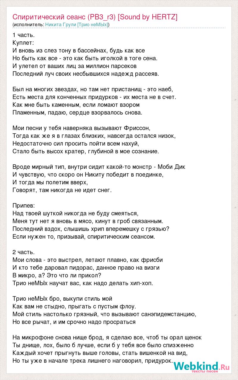 1 часть. Куплет: И вновь из слез тону в бассейнах, будь как все Но быть как все - это как быть иголкой в тоге сена. И улетел от ваших лиц за миллион парсеков Последний луч своих несбывшихся надежд рассеяв. Был на многих звездах, но там нет пристанищ - это наеб, Есть места для конченных придурков - их места не в счет. Как мне быть каменным, если ломают взором Пламенным, падаю, сердце взорвалось снова. Мои песни у тебя наверняка вызывают Фриссон, Тогда как же я в глазах близких, навсегда остался низок, Недостаточно сил просить пойти всем нахуй, Стало быть высох кратер, глубиной в мое сознание. Вроде мирный тип, внутри сидит какой-то монстр - Моби Дик И чувствую, что скоро он Никиту победит в поединке, И тогда мы полетим вверх, Говорят, там никогда не идет снег. Припев: Над твоей шуткой никогда не буду смеяться, Меня тут нет я вновь в мясо, кинут в гроб связанным. Последний вздох, слышишь хрип вперемешку с грязью? Если нужен то, призывай, спиритическим сеансом. 2 часть. Мои слова - это выстрел, летают плавно, как фрисби И кто тебе даровал пидорас, данное право на визги В микро, а? Это что ли прикол? Трио неМЫх научат вас, как надо делать хип-хоп. Трио неМЫх бро, выкупи стиль мой Как вам не стыдно, прыгать с пустым флоу. Мой стиль настолько грязный, что вызывают санэпидемстанцию, Но все рычат, и им срочно надо просраться На микрофоне снова нище брод, я сделаю все, чтоб ты орал щенок Ты днище, лох, было б лучше, если б у тебя все было спизженно Каждый хочет прыгнуть выше головы, стать вишенкой на вид, Но ты уже в начале трека лишнего наговорил, придурок.