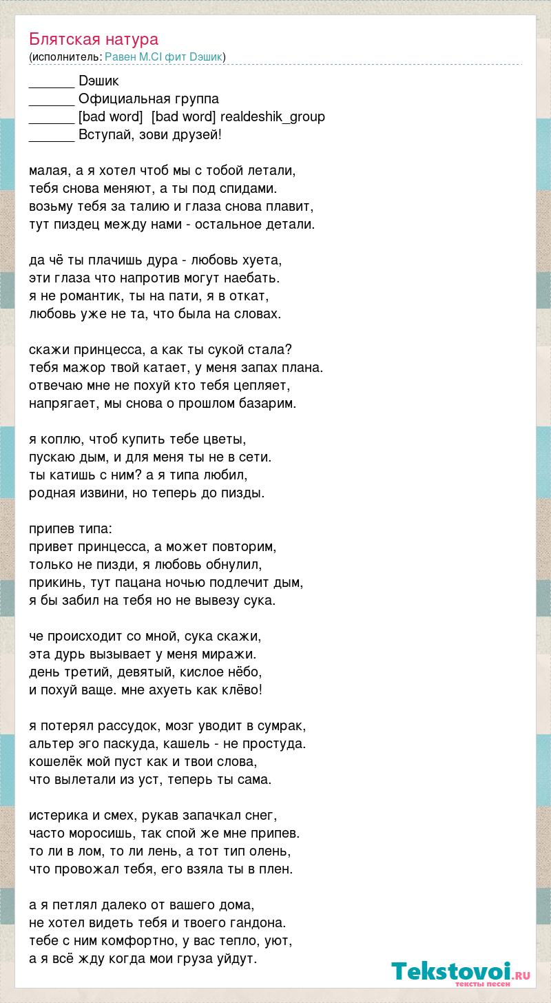 ______ Dэшик ______ Официальная группа ______ [bad word] [bad word] realdeshik_group ______ Вступай, зови друзей! малая, а я хотел чтоб мы с тобой летали, тебя снова меняют, а ты под спидами. возьму тебя за талию и глаза снова плавит, тут пиздец между нами - остальное детали. да чё ты плачишь дура - любовь хуета, эти глаза что напротив могут наебать. я не романтик, ты на пати, я в откат, любовь уже не та, что была на словах. скажи принцесса, а как ты сукой стала? тебя мажор твой катает, у меня запах плана. отвечаю мне не похуй кто тебя цепляет, напрягает, мы снова о прошлом базарим. я коплю, чтоб купить тебе цветы, пускаю дым, и для меня ты не в сети. ты катишь с ним? а я типа любил, родная извини, но теперь до пизды. припев типа: привет принцесса, а может повторим, только не пизди, я любовь обнулил, прикинь, тут пацана ночью подлечит дым, я бы забил на тебя но не вывезу сука. че происходит со мной, сука скажи, эта дурь вызывает у меня миражи. день третий, девятый, кислое нёбо, и похуй ваще. мне ахуеть как клёво! я потерял рассудок, мозг уводит в сумрак, альтер эго паскуда, кашель - не простуда. кошелёк мой пуст как и твои слова, что вылетали из уст, теперь ты сама. истерика и смех, рукав запачкал снег, часто моросишь, так спой же мне припев. то ли в лом, то ли лень, а тот тип олень, что провожал тебя, его взяла ты в плен. а я петлял далеко от вашего дома, не хотел видеть тебя и твоего гандона. тебе с ним комфортно, у вас тепло, уют, а я всё жду когда мои груза уйдут.