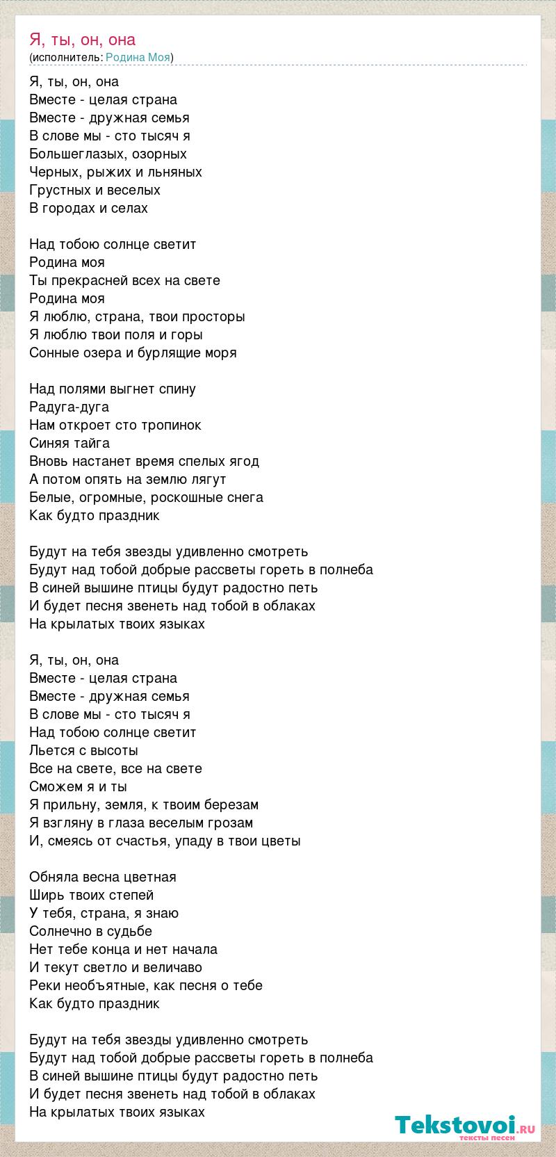 Я, ты, он, она Вместе - целая страна Вместе - дружная семья В слове мы - сто тысяч я Большеглазых, озорных Черных, рыжих и льняных Грустных и веселых В городах и селах Над тобою солнце светит Родина моя Ты прекрасней всех на свете Родина моя Я люблю, страна, твои просторы Я люблю твои поля и горы Сонные озера и бурлящие моря Над полями выгнет спину Радуга-дуга Нам откроет сто тропинок Синяя тайга Вновь настанет время спелых ягод А потом опять на землю лягут Белые, огромные, роскошные снега Как будто праздник Будут на тебя звезды удивленно смотреть Будут над тобой добрые рассветы гореть в полнеба В синей вышине птицы будут радостно петь И будет песня звенеть над тобой в облаках На крылатых твоих языках Я, ты, он, она Вместе - целая страна Вместе - дружная семья В слове мы - сто тысяч я Над тобою солнце светит Льется с высоты Все на свете, все на свете Сможем я и ты Я прильну, земля, к твоим березам Я взгляну в глаза веселым грозам И, смеясь от счастья, упаду в твои цветы Обняла весна цветная Ширь твоих степей У тебя, страна, я знаю Солнечно в судьбе Нет тебе конца и нет начала И текут светло и величаво Реки необъятные, как песня о тебе Как будто праздник Будут на тебя звезды удивленно смотреть Будут над тобой добрые рассветы гореть в полнеба В синей вышине птицы будут радостно петь И будет песня звенеть над тобой в облаках На крылатых твоих языках