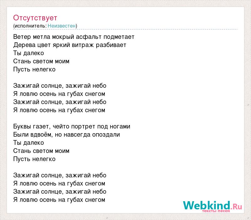 Ветер метла мокрый асфальт подметает Дерева цвет яркий витраж разбивает Ты далеко Стань светом моим Пусть нелегко Зажигай солнце, зажигай небо Я ловлю осень на губах снегoм Зажигай солнце, зажигай небо Я ловлю осень на губах снегом Буквы газет, чейто портрет под ногами Были вдвоём, но навсегда опоздали Ты далеко Стань светом моим Пусть нелегко Зажигай солнце, зажигай небо Я ловлю осень на губах снегoм Зажигай солнце, зажигай небо Я ловлю осень на губах снегом